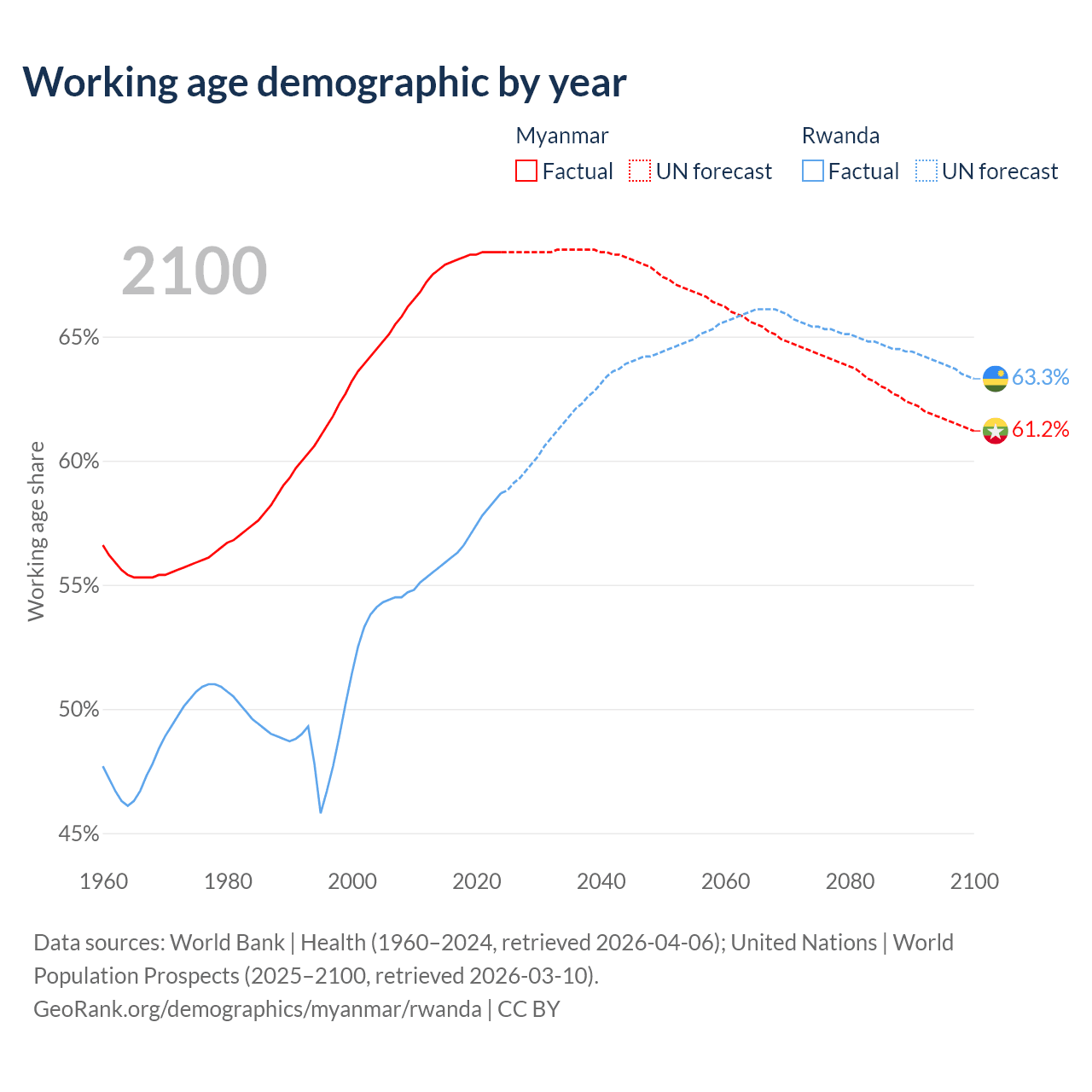- Myanmar has 37.8M working age adults (aged 15-64) vs 8.79M in Rwanda.