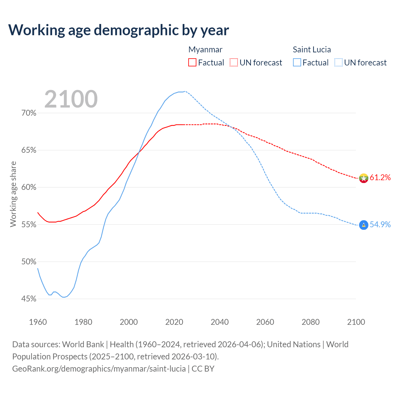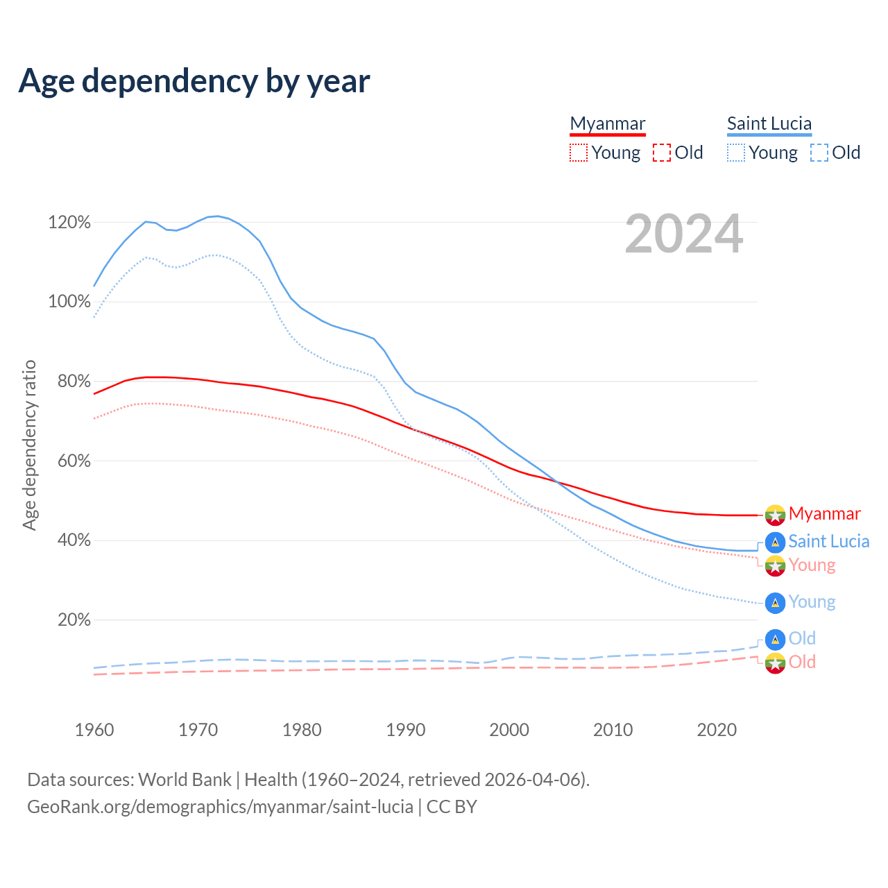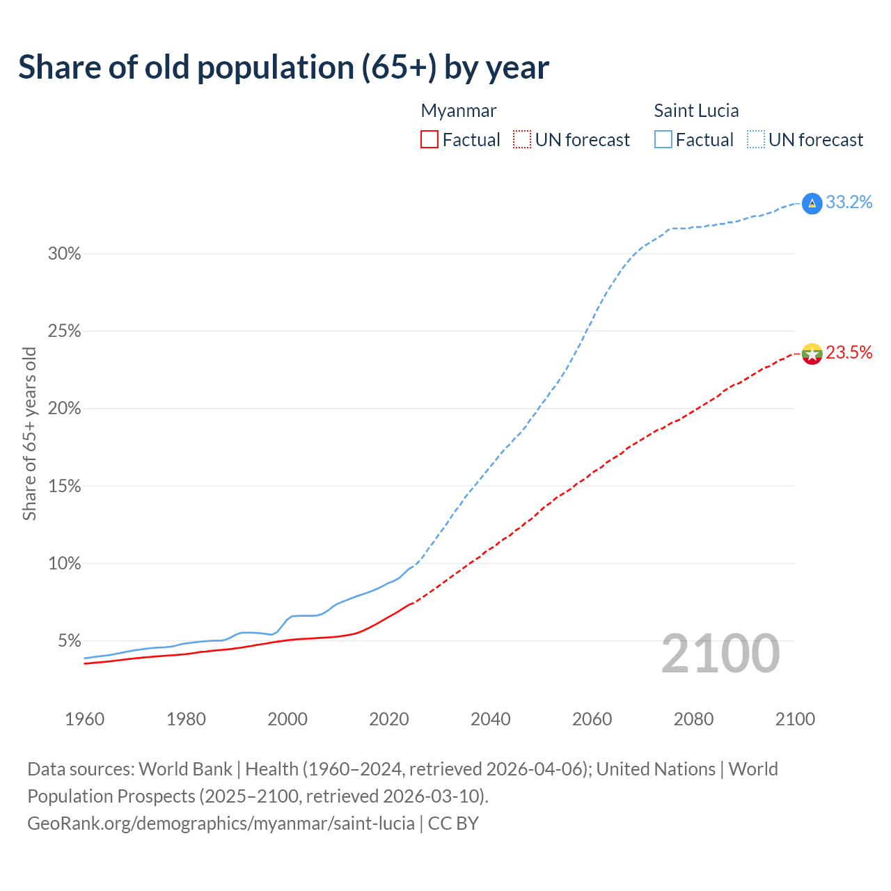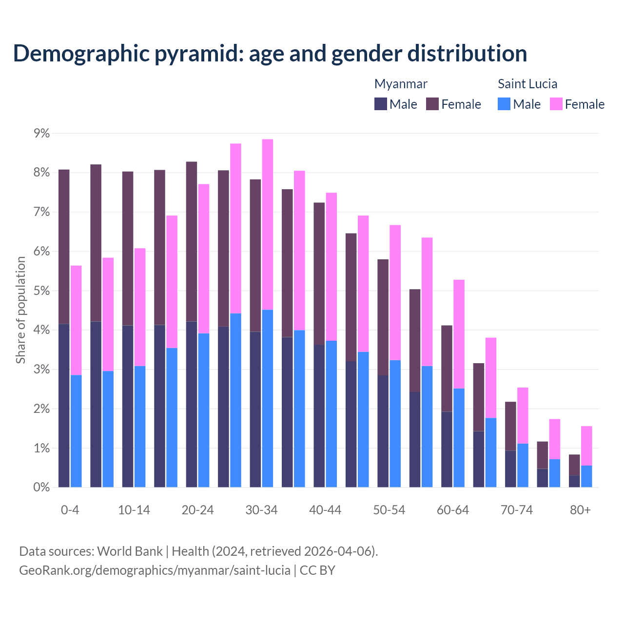 The share of older people aged 65 and over is 7.3% in Myanmar and 9.62% in Saint Lucia. Life expectancy in Myanmar compared to Saint Lucia .