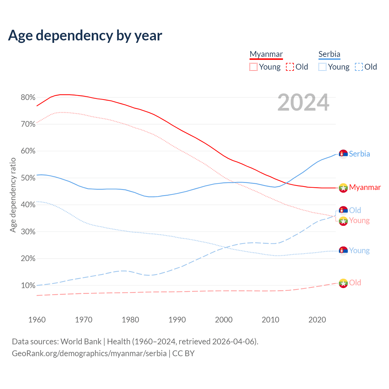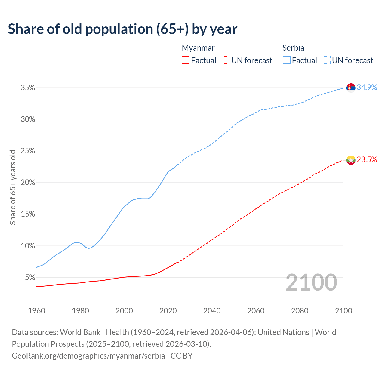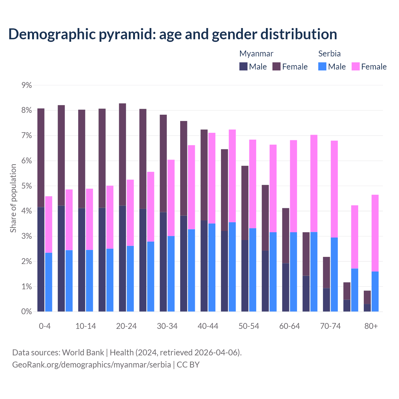 The share of older people aged 65 and over is 7.3% in Myanmar and 22.7% in Serbia. Life expectancy in Myanmar compared to Serbia .