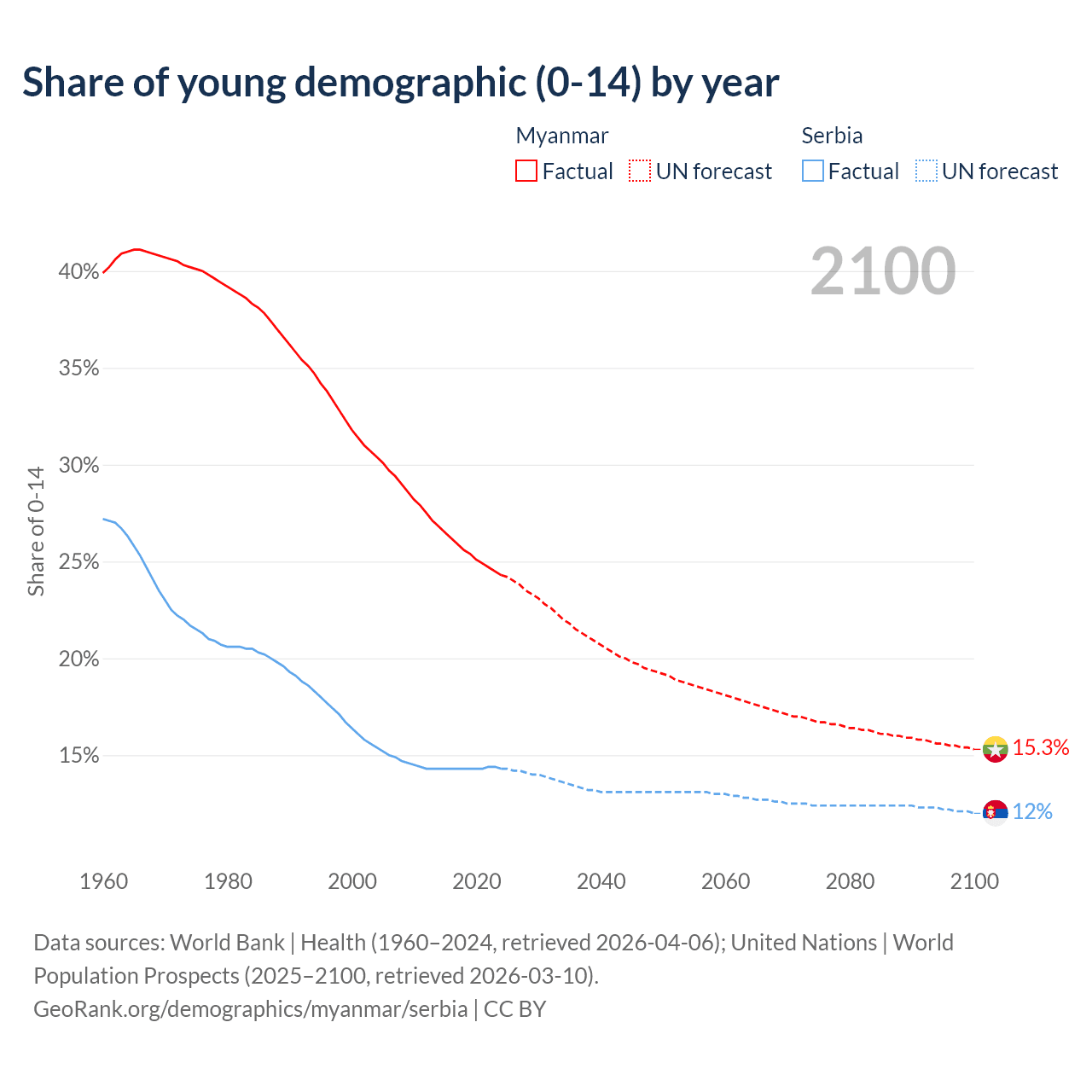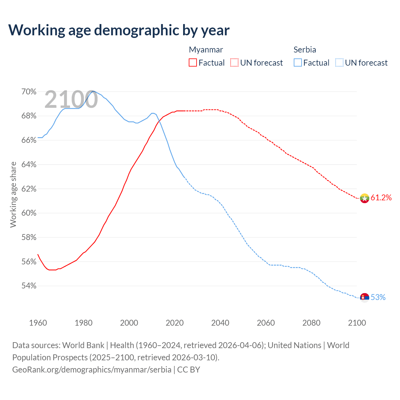 Median age Myanmar vs Serbia, 1960-2100