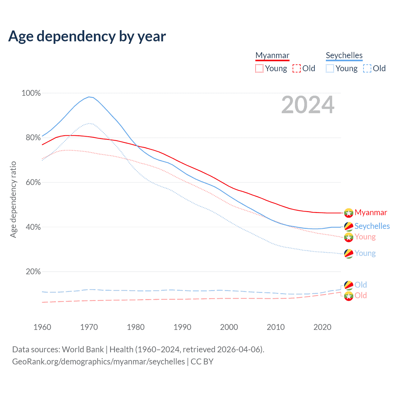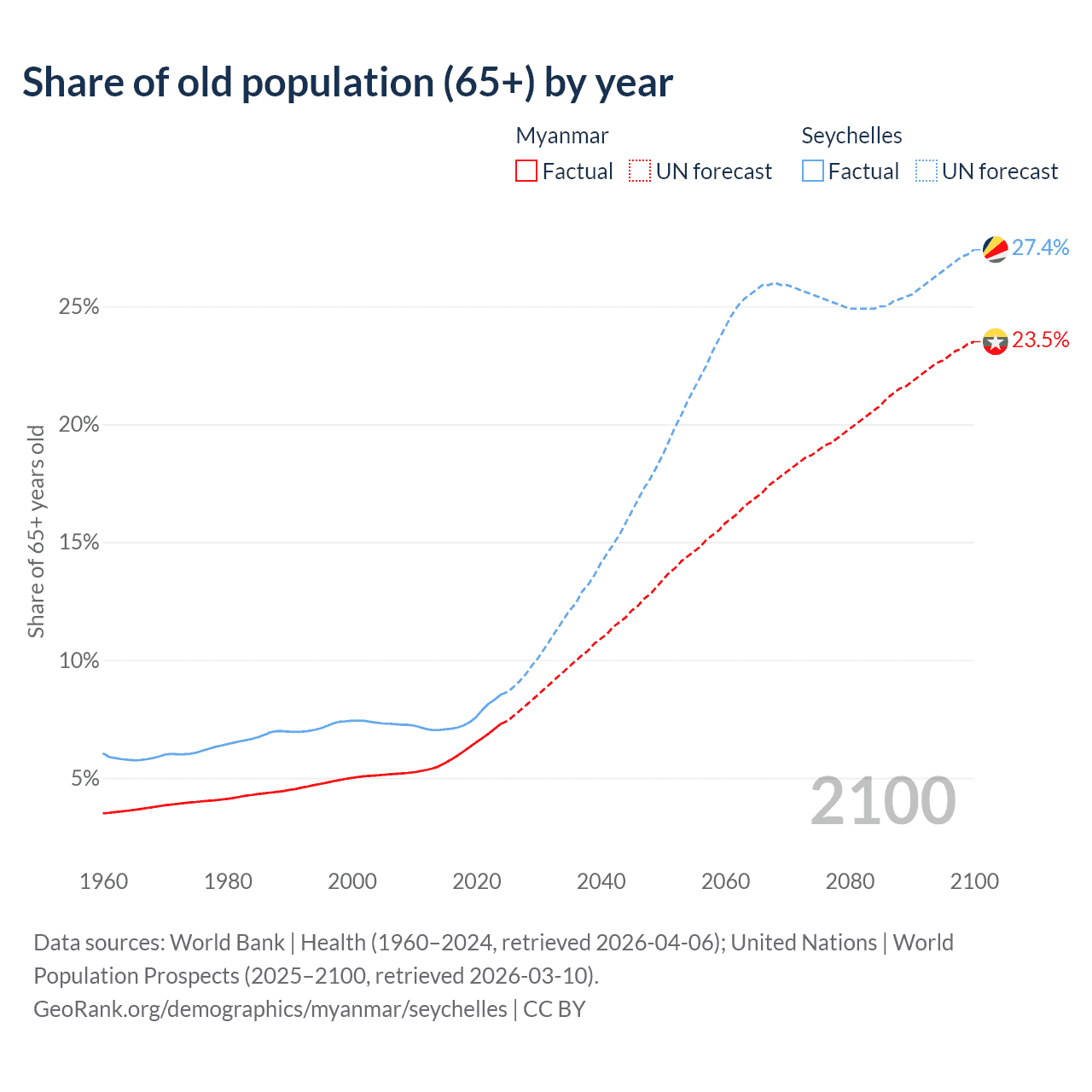 The share of older people aged 65 and over is 7.3% in Myanmar and 8.54% in the Seychelles. Life expectancy in Myanmar compared to the Seychelles .