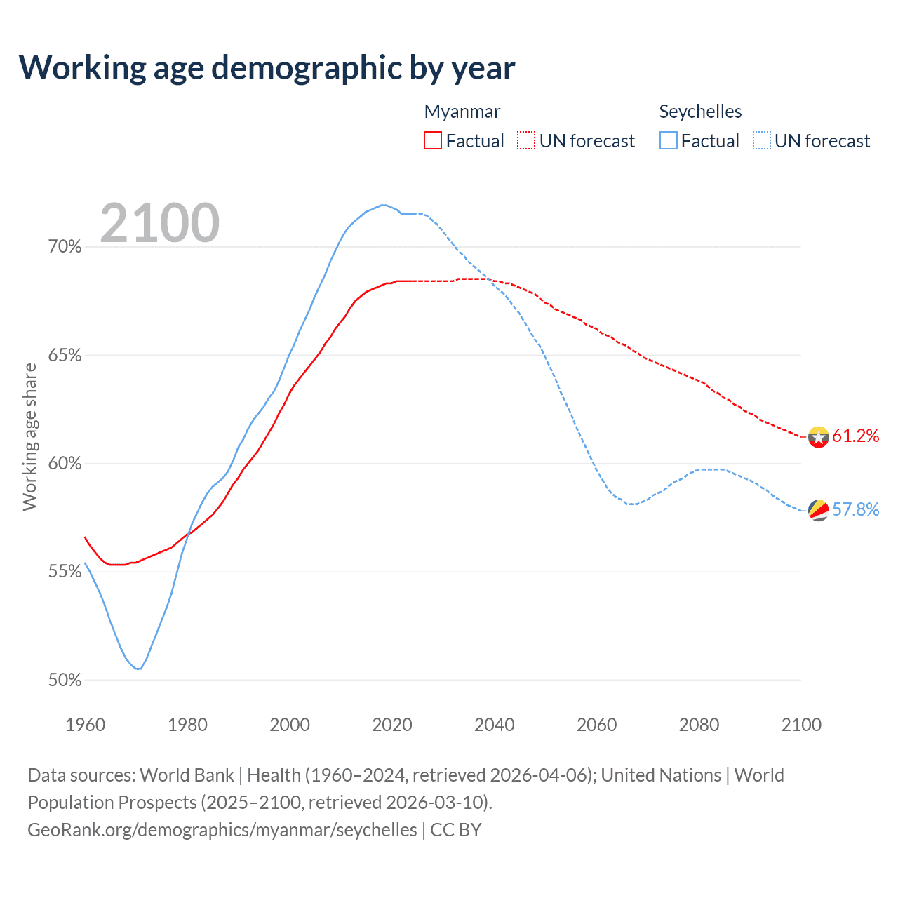 Median age Myanmar vs Seychelles, 1960-2100