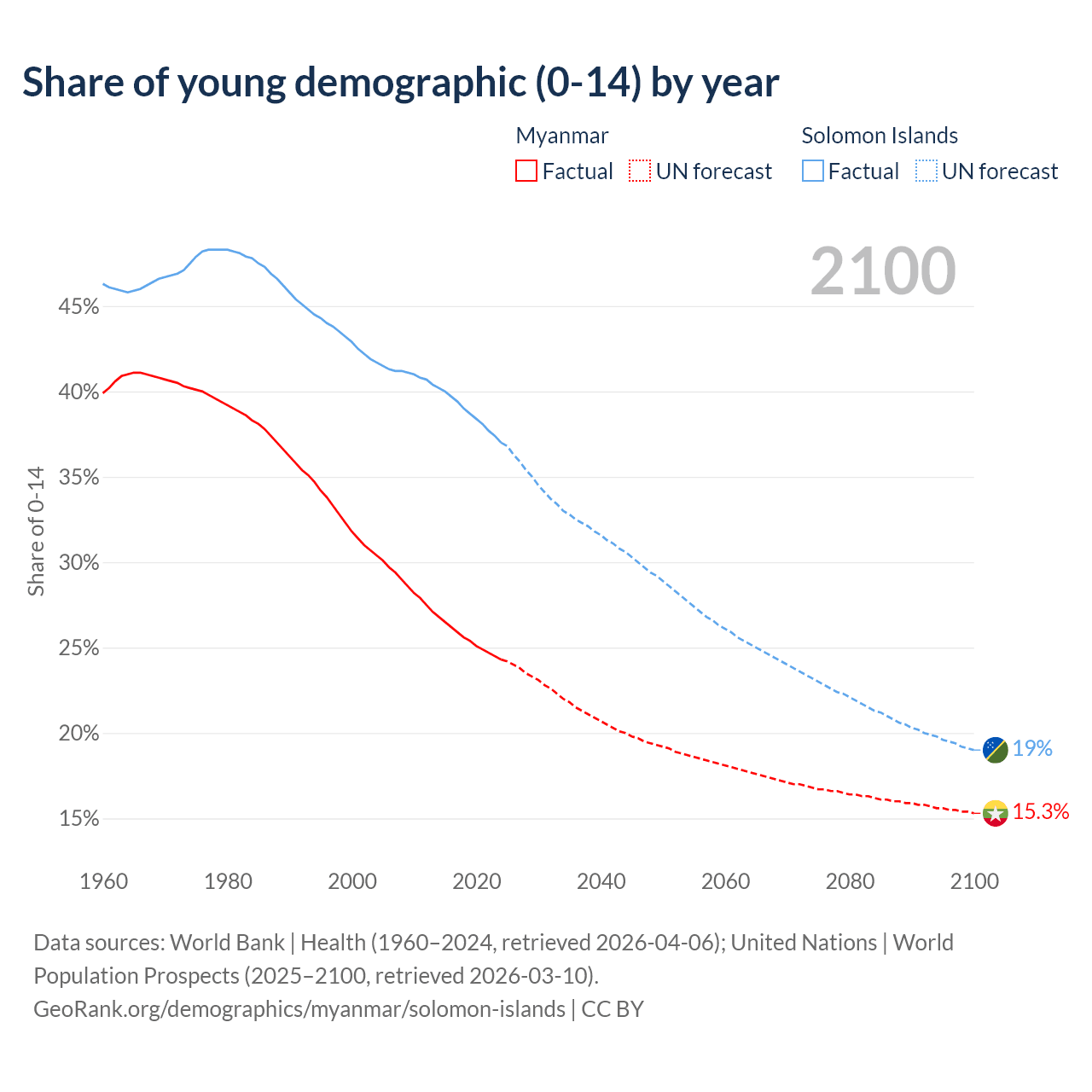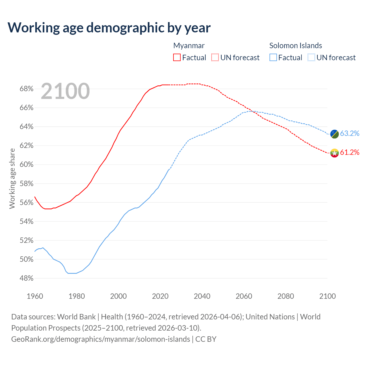 Median age Myanmar vs Solomon Islands, 1960-2100