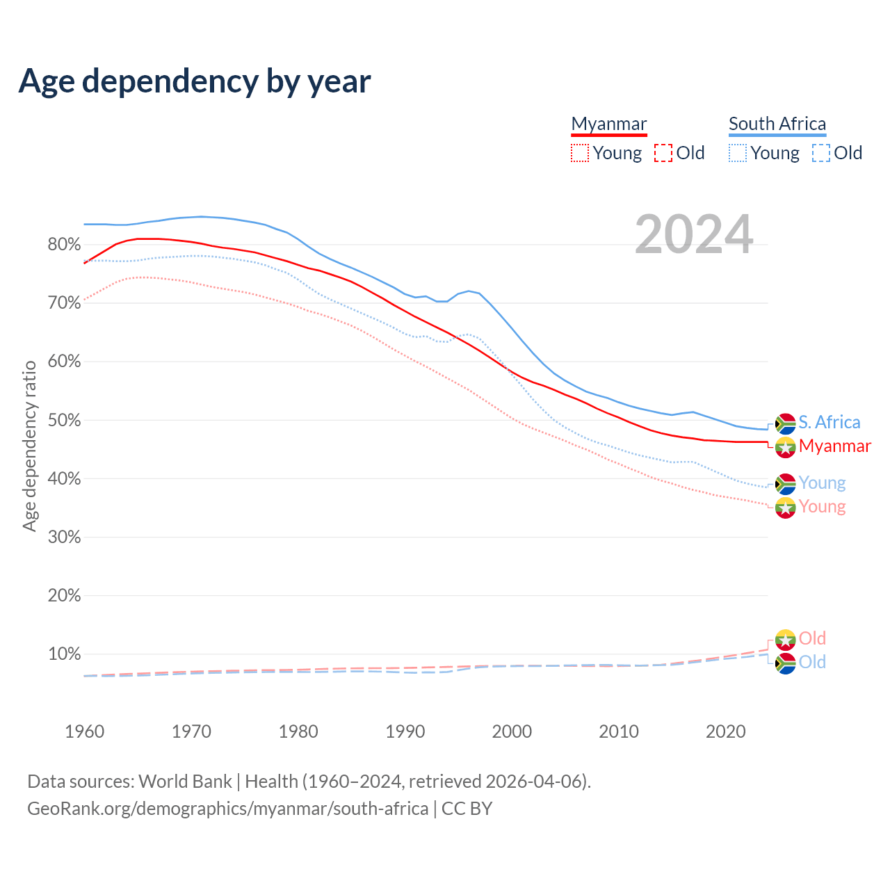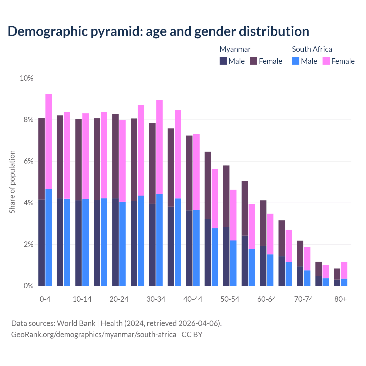 - Myanmar is ranked 96/196 by median age (oldest to youngest) vs 107/196 for South Africa.