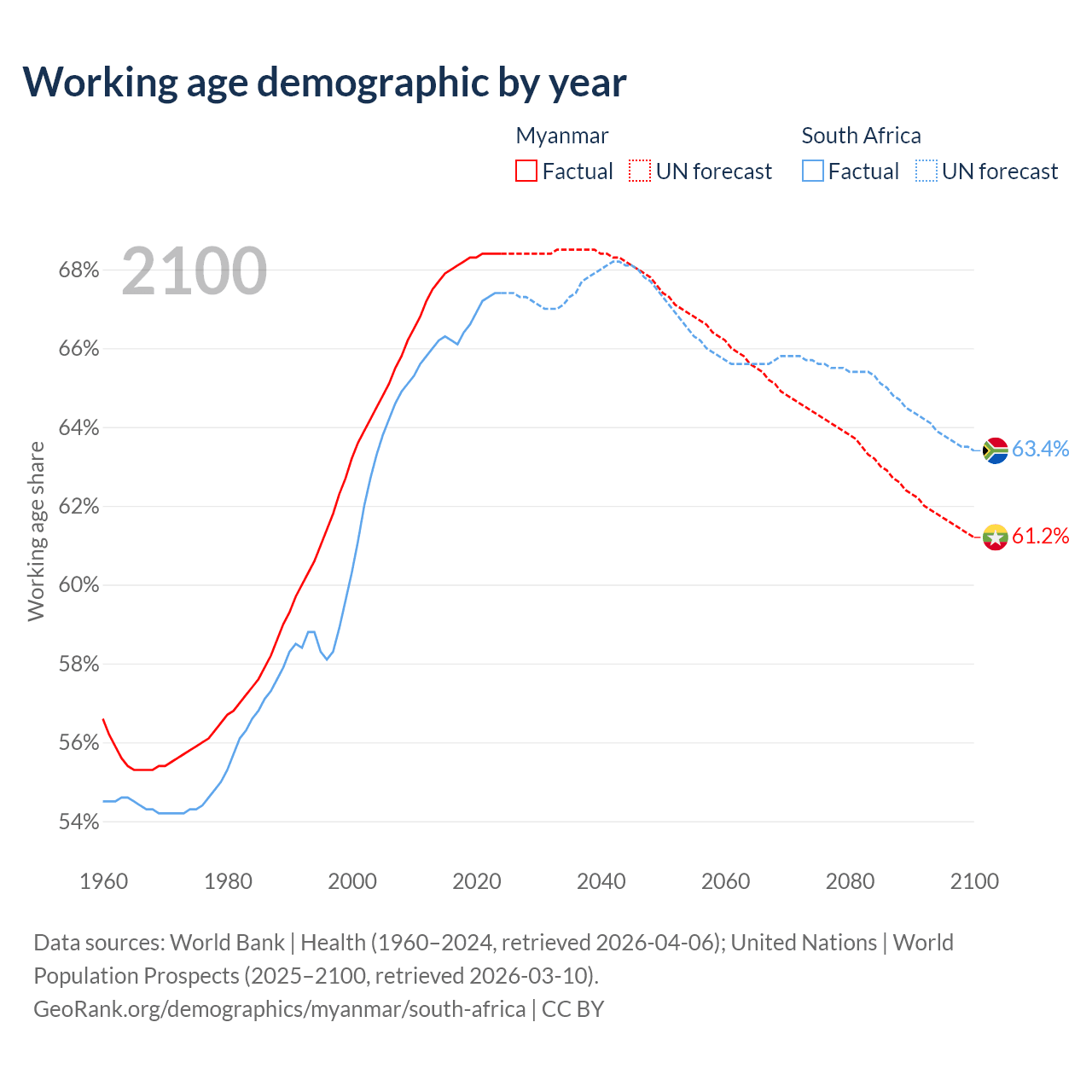 - Myanmar has 37.8M working age adults (aged 15-64) vs 44.3M in South Africa.