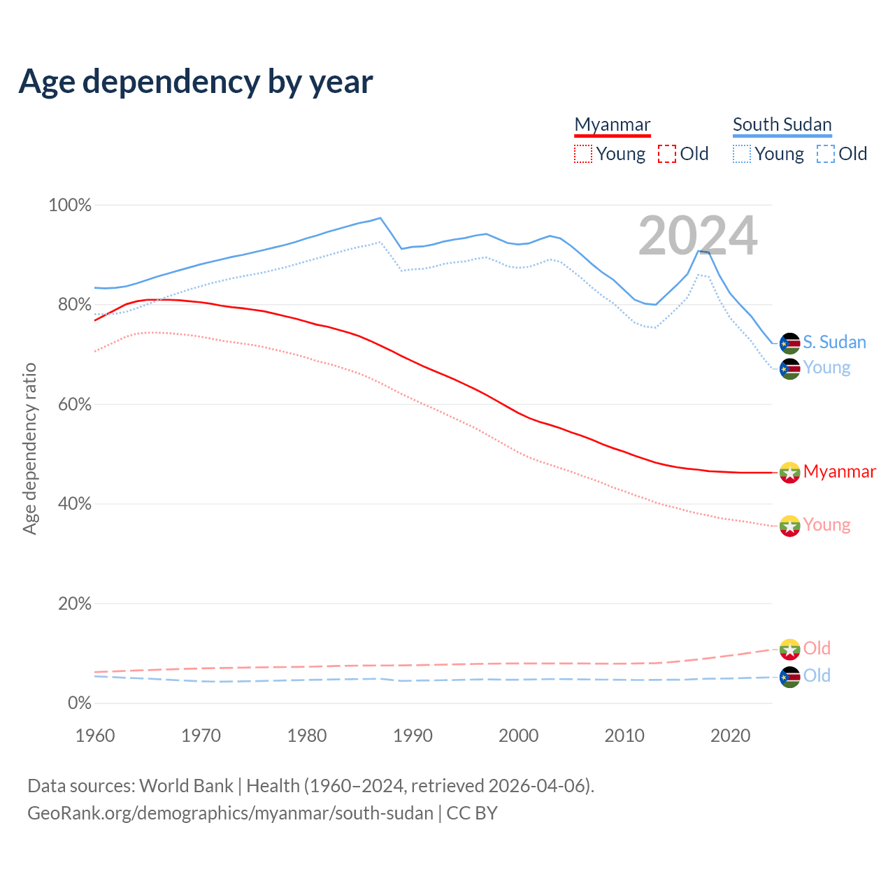 Data sources: World Bank | Health (1960–2024, retrieved 2026-04-06); U.S. Census Bureau (1960–2024, retrieved 2026-02-08).
