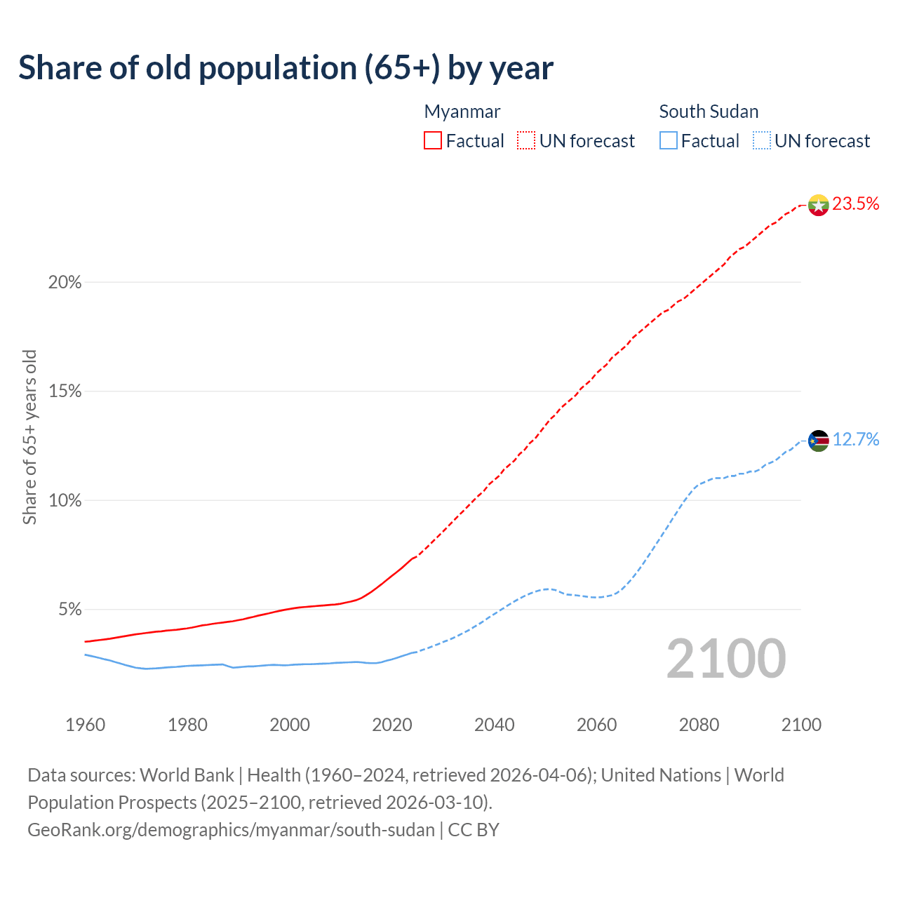 The share of older people aged 65 and over is 7.3% in Myanmar and 2.99% in South Sudan. Life expectancy in Myanmar compared to South Sudan .