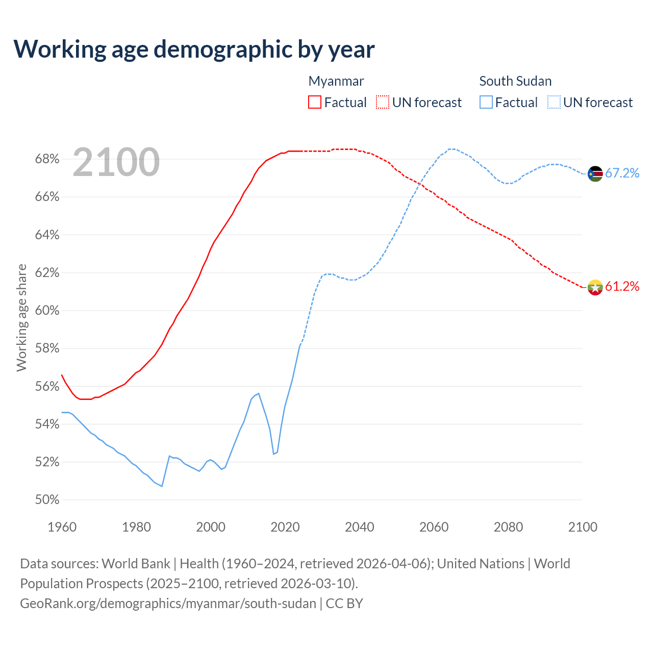 Median age Myanmar vs South Sudan, 1960-2100