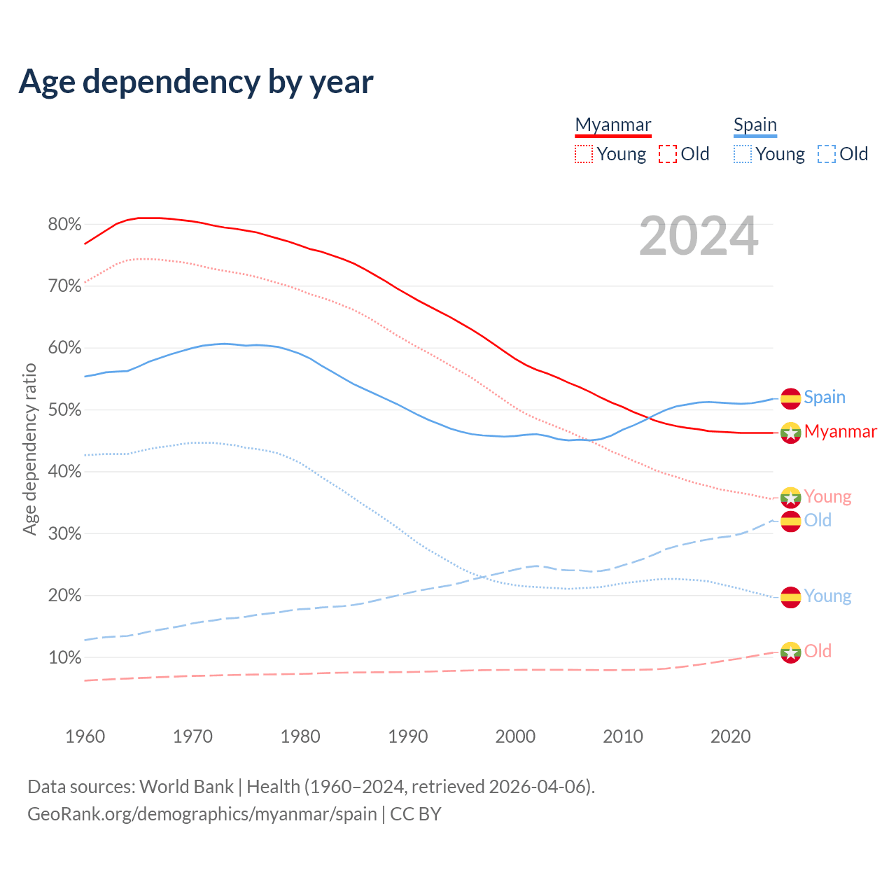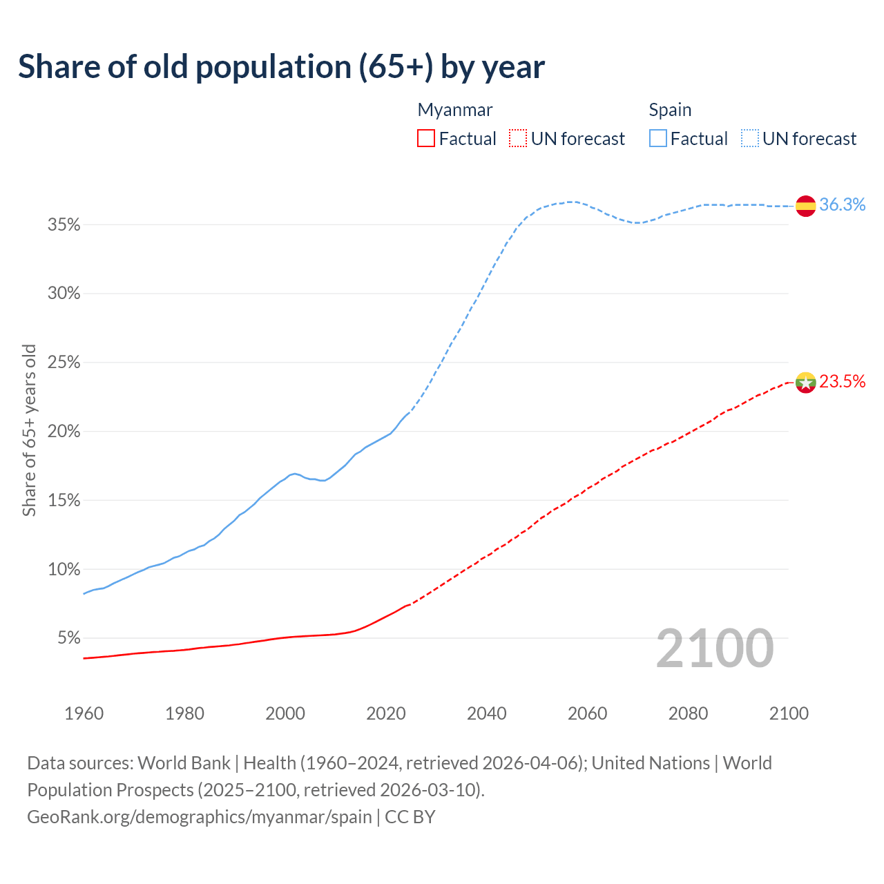 The share of older people aged 65 and over is 7.3% in Myanmar and 21.1% in Spain. Life expectancy in Myanmar compared to Spain .