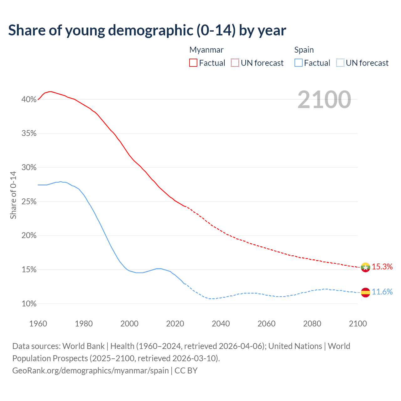- The total fertility rate is 2.12 in Myanmar compared to 1.12 in Spain.