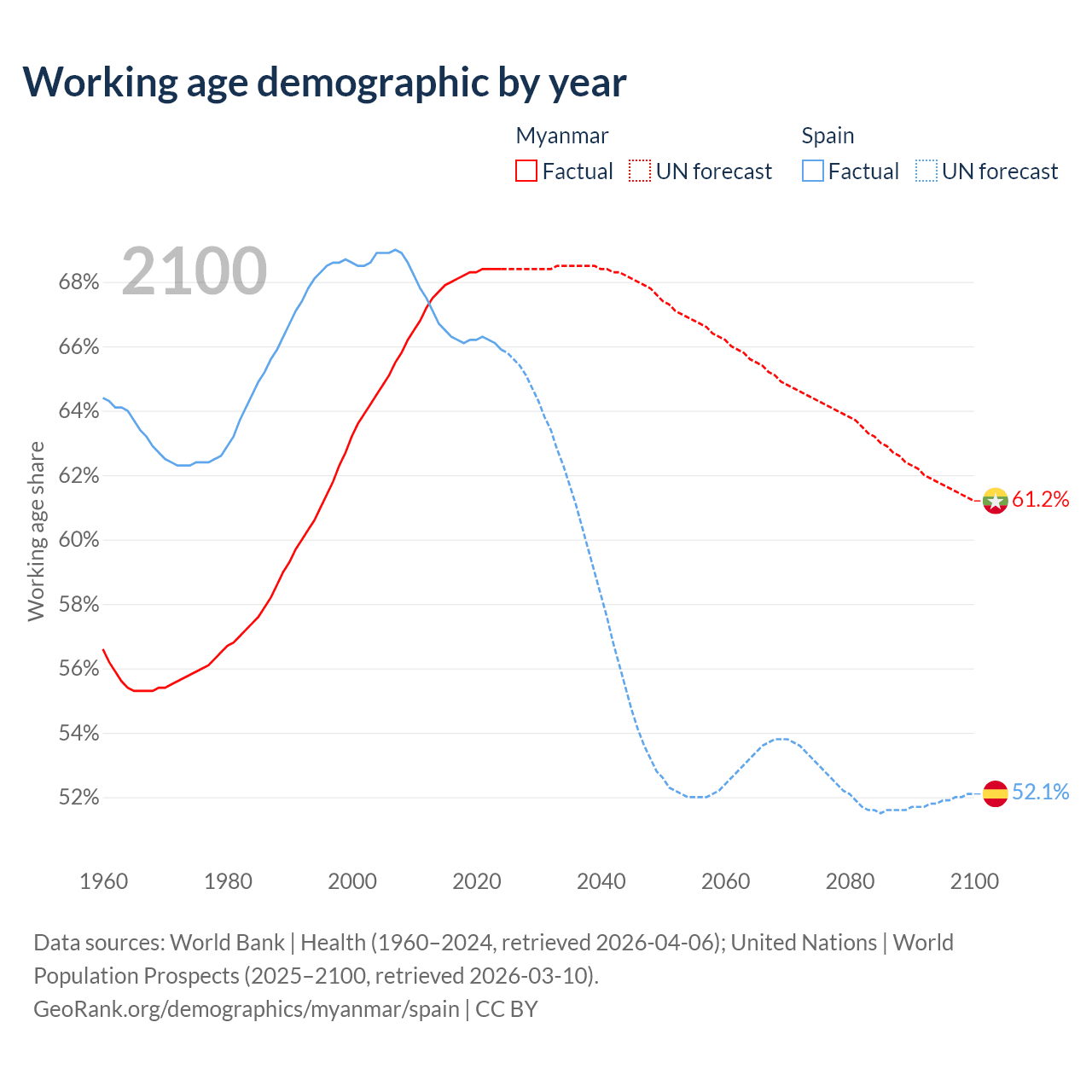 - Myanmar has 37.8M working age adults (aged 15-64) vs 32.2M in Spain.