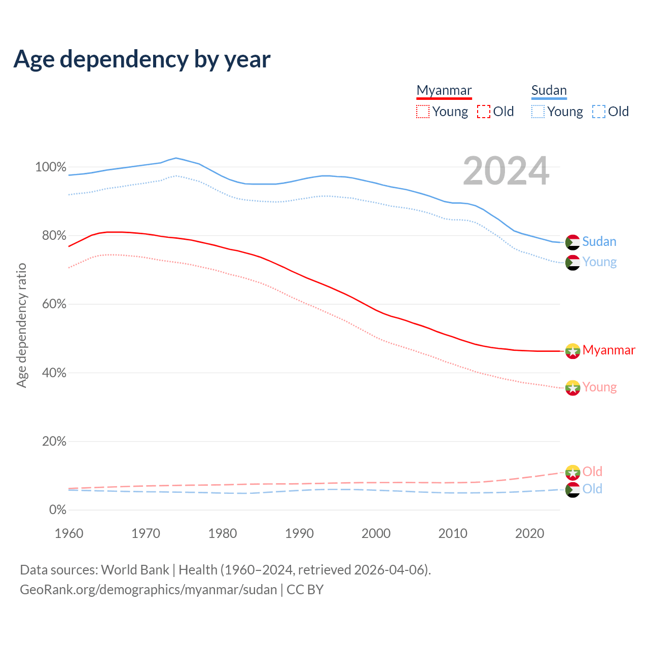 - Myanmar is ranked 96/196 by median age (oldest to youngest) vs 172/196 for Sudan.