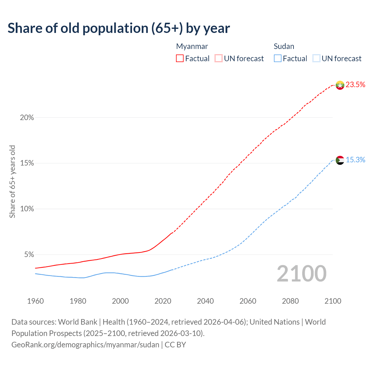 The share of older people aged 65 and over is 7.3% in Myanmar and 3.3% in Sudan. Life expectancy in Myanmar compared to Sudan .