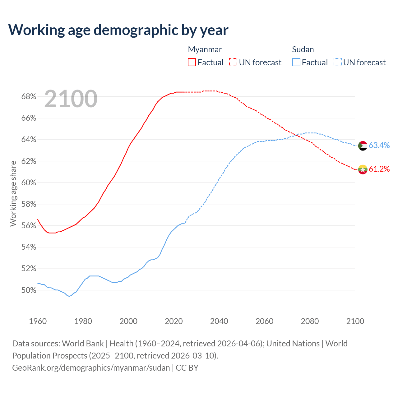 - Myanmar has 37.8M working age adults (aged 15-64) vs 30M in Sudan.