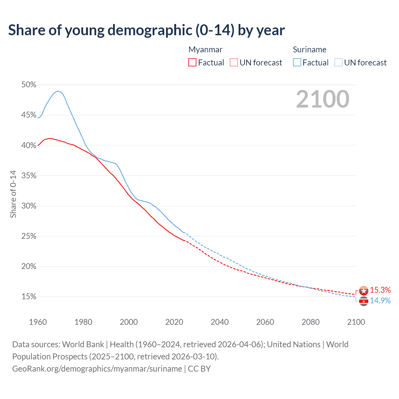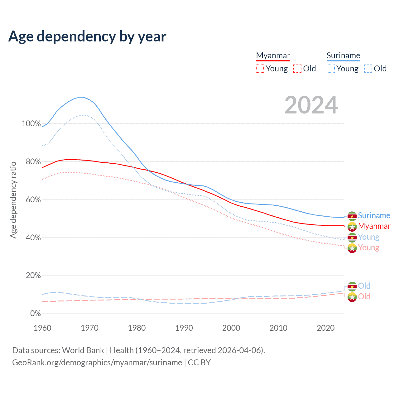- The share of young demographic (0-15 years old) in Myanmar is 24.3% vs 25.6% in Suriname.