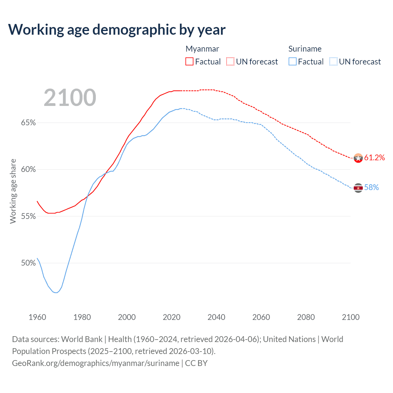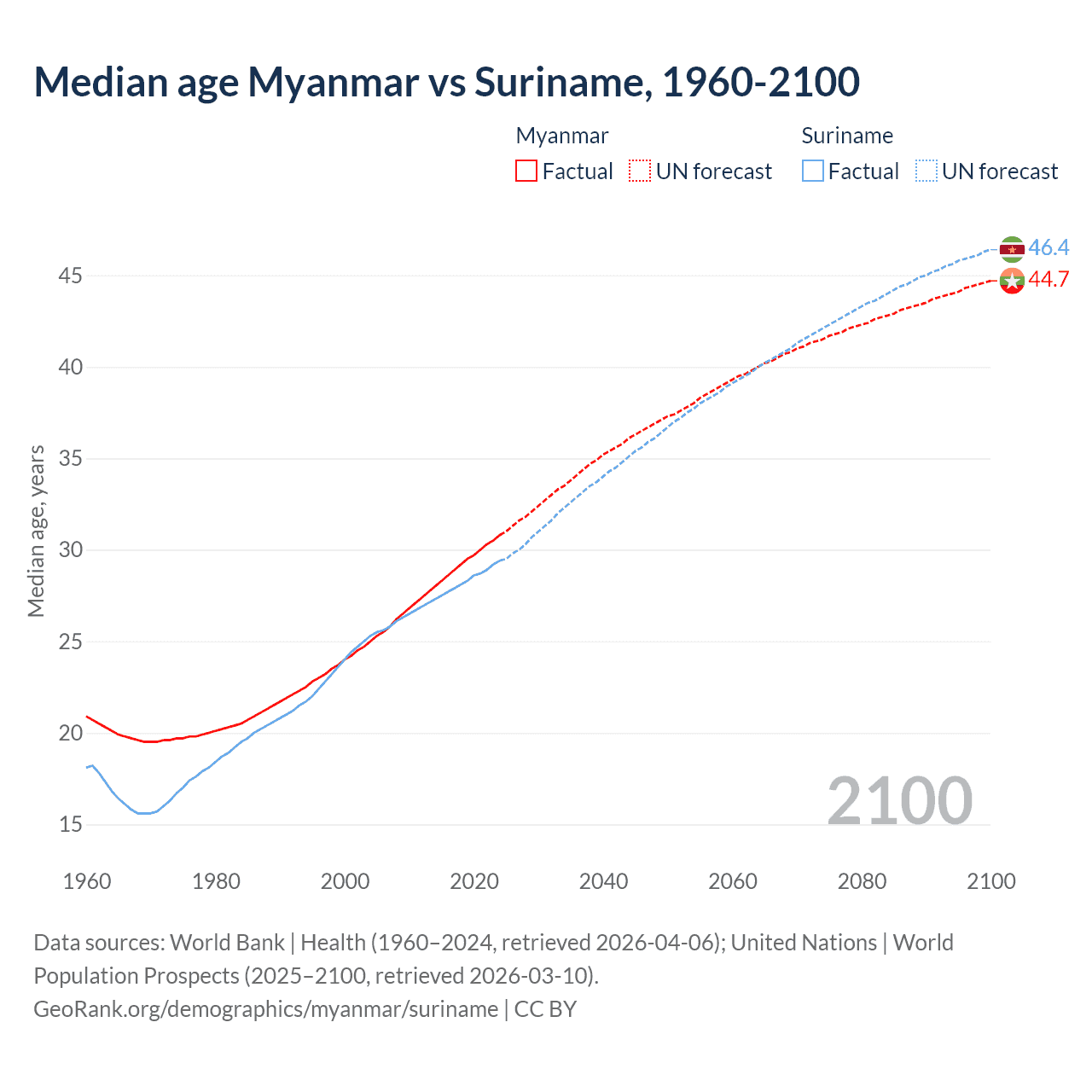Median age Myanmar vs Suriname, 1960-2100