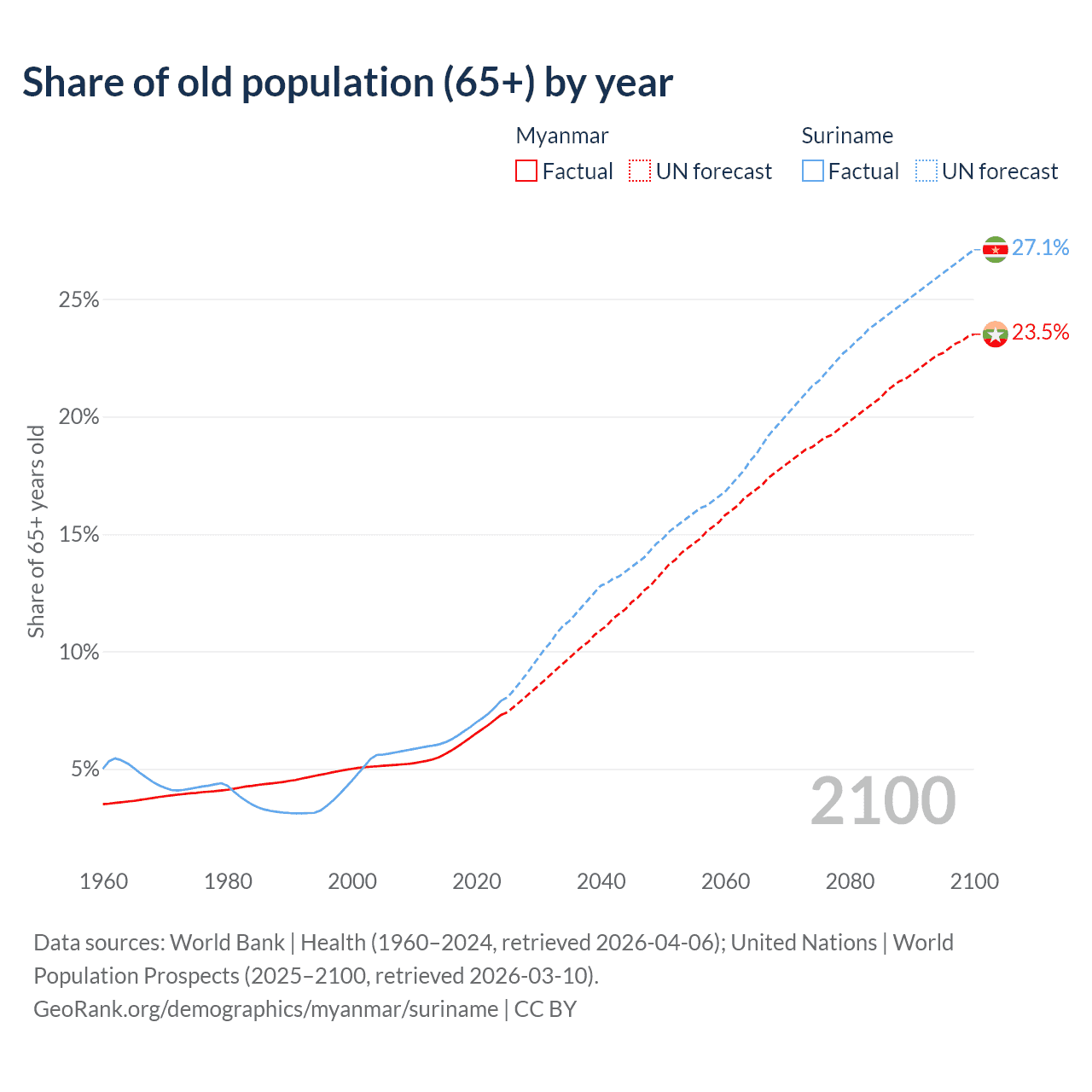The share of older people aged 65 and over is 7.3% in Myanmar and 7.9% in Suriname. Life expectancy in Myanmar compared to Suriname .