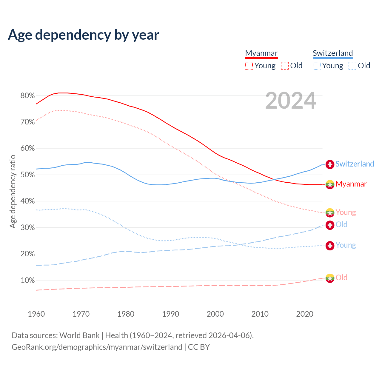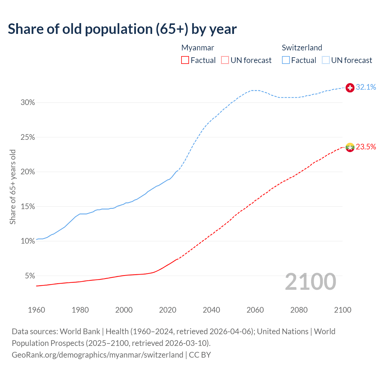 The share of older people aged 65 and over is 7.3% in Myanmar and 20% in Switzerland. Life expectancy in Myanmar compared to Switzerland .
