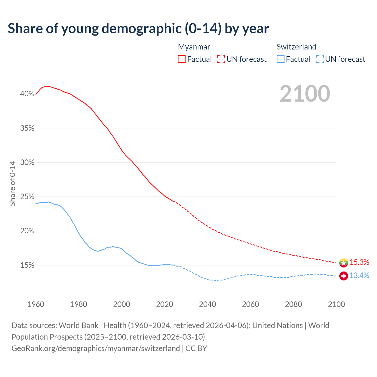 - The share of young demographic (0-15 years old) in Myanmar is 24.3% vs 15% in Switzerland.