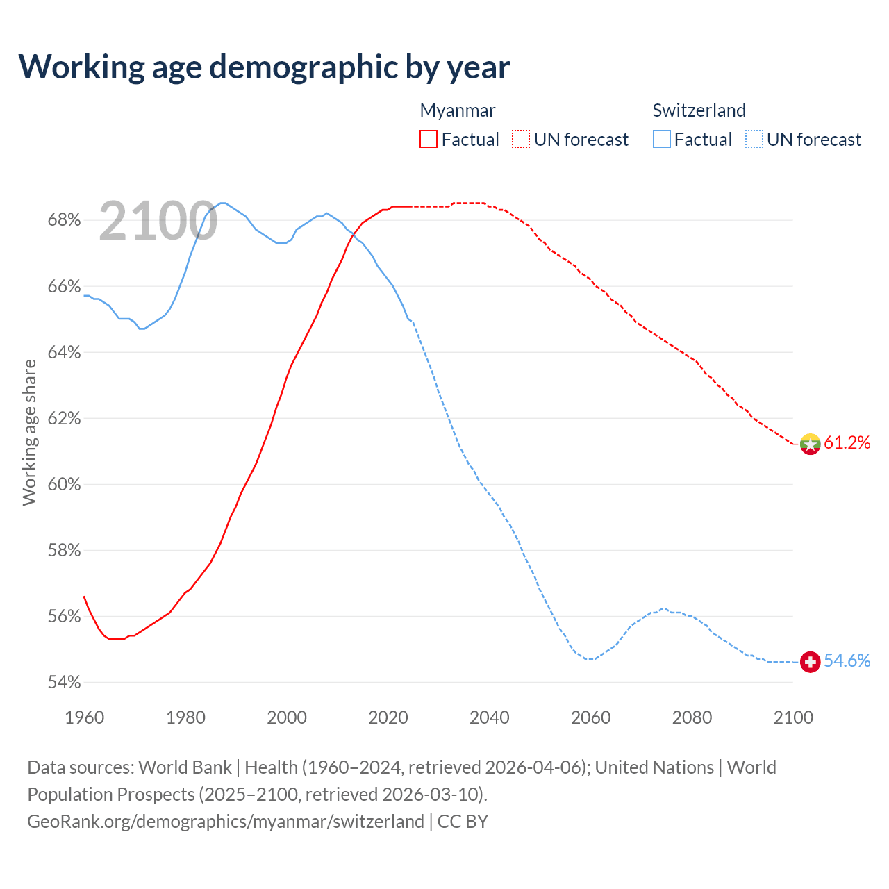 - Myanmar has 37.8M working age adults (aged 15-64) vs 5.92M in Switzerland.