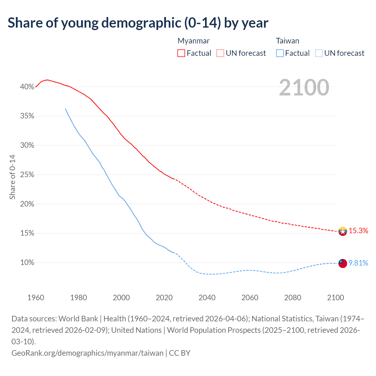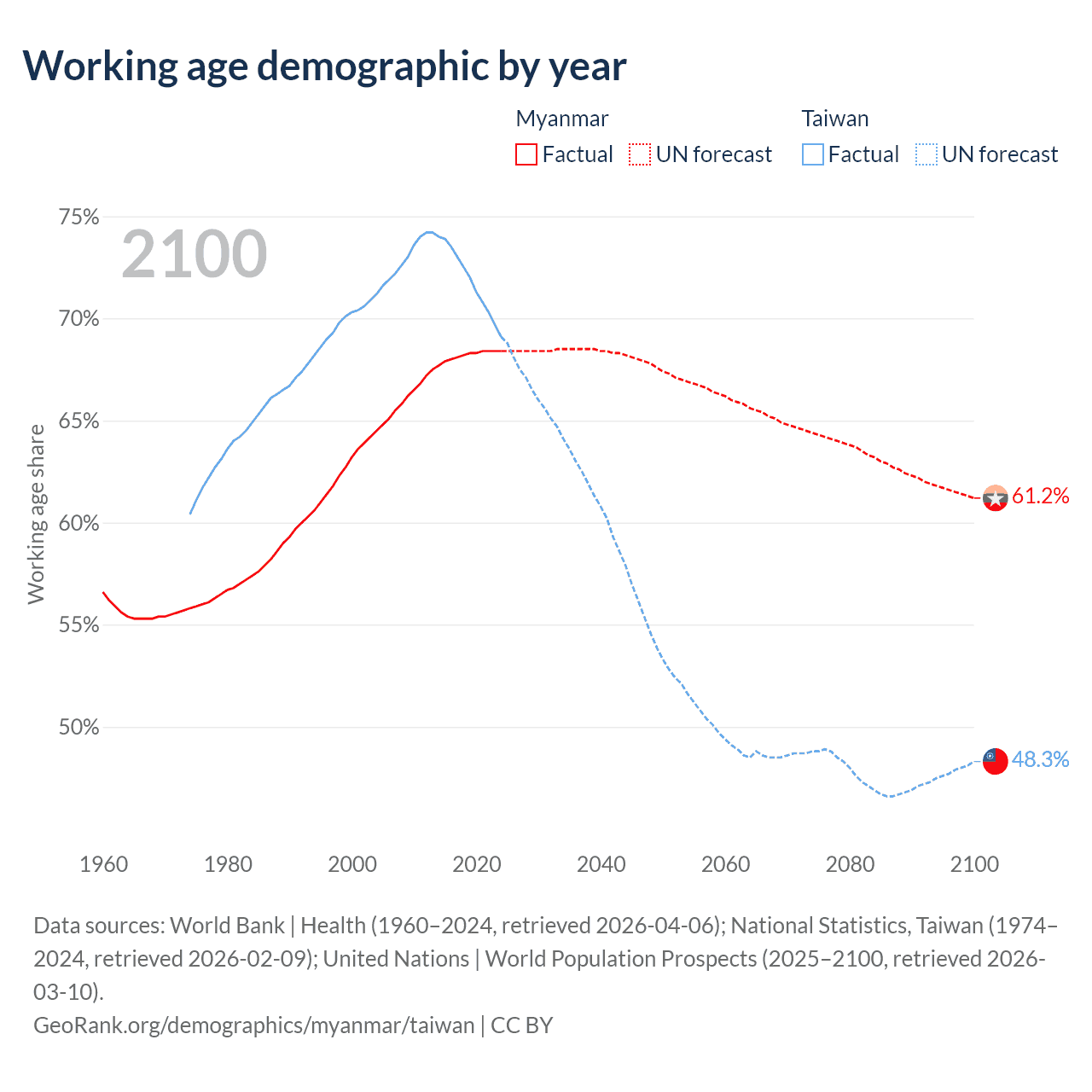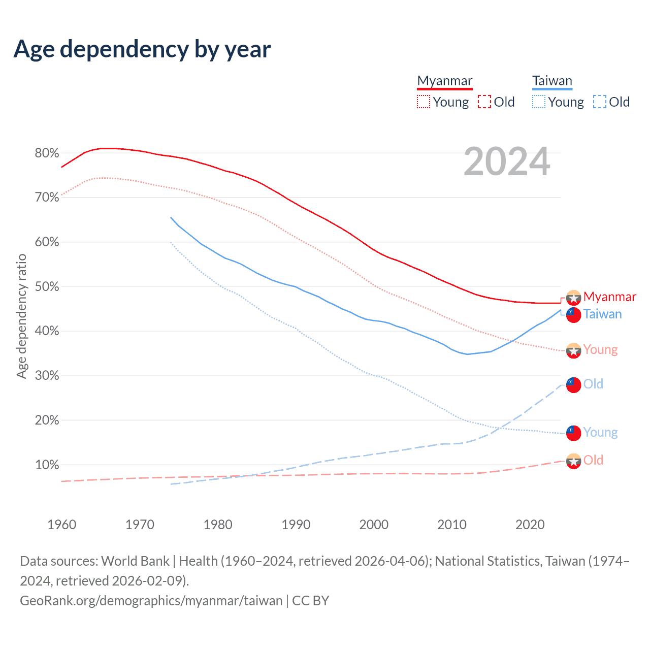 Data sources: World Bank | Health (1960–2024, retrieved 2026-04-06); U.S. Census Bureau (1960–2024, retrieved 2026-02-08); National Statistics, Taiwan (1974–2024, retrieved 2026-02-09).