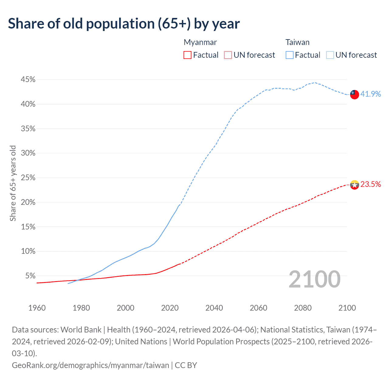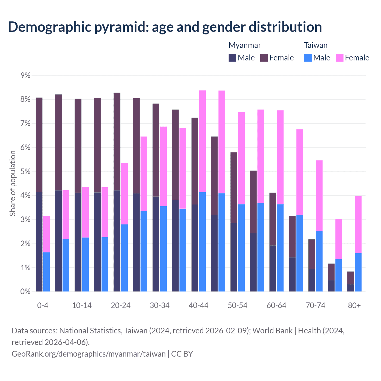 The share of older people aged 65 and over is 7.3% in Myanmar and 19.2% in Taiwan. Life expectancy in Myanmar compared to Taiwan .