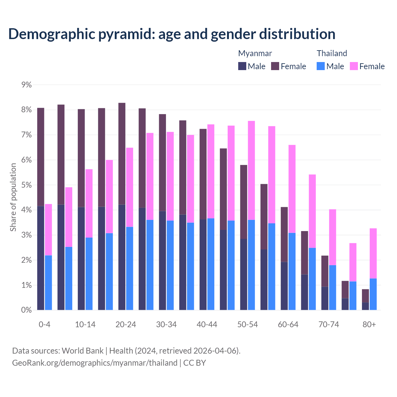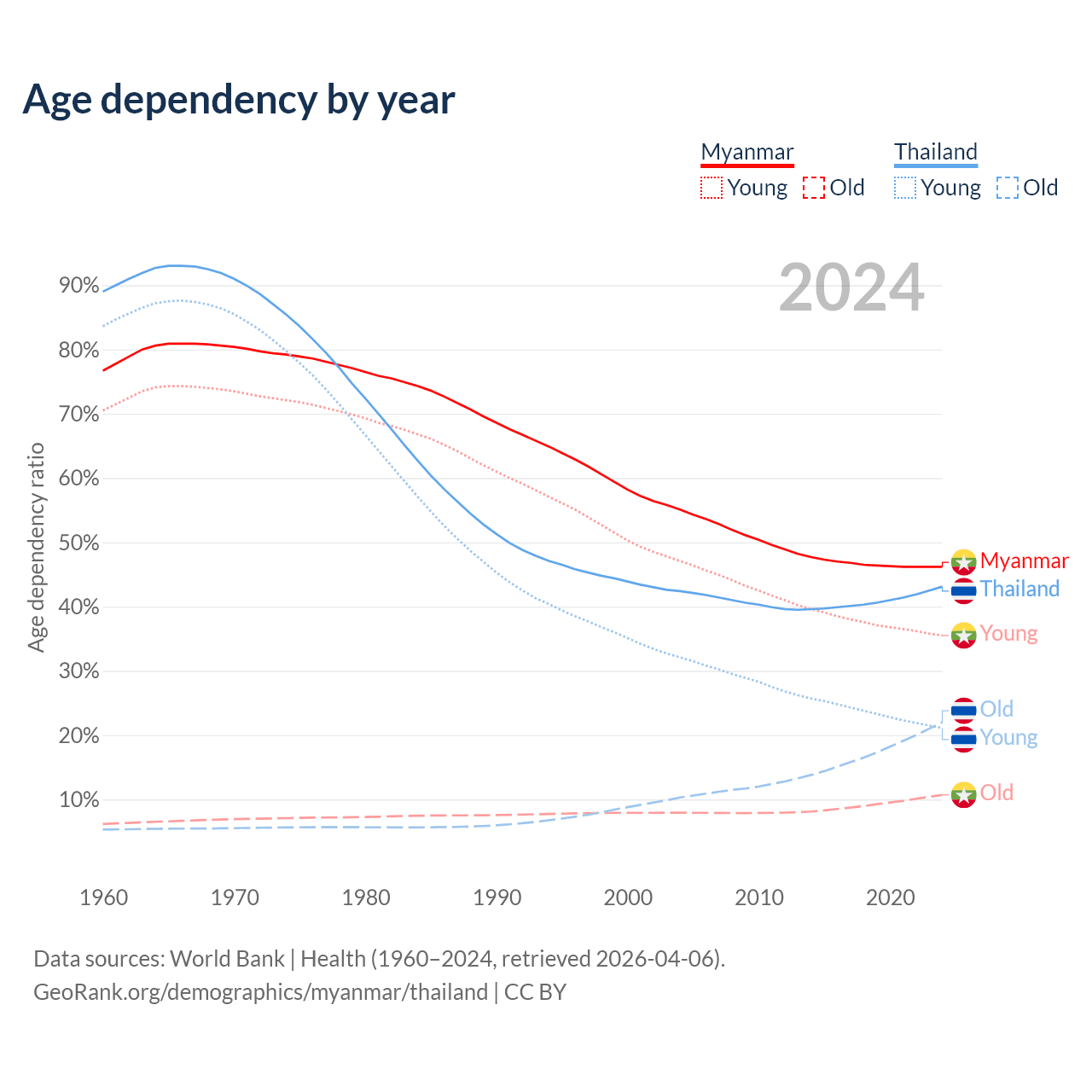 - Myanmar is ranked 96/196 by median age (oldest to youngest) vs 40/196 for Thailand.