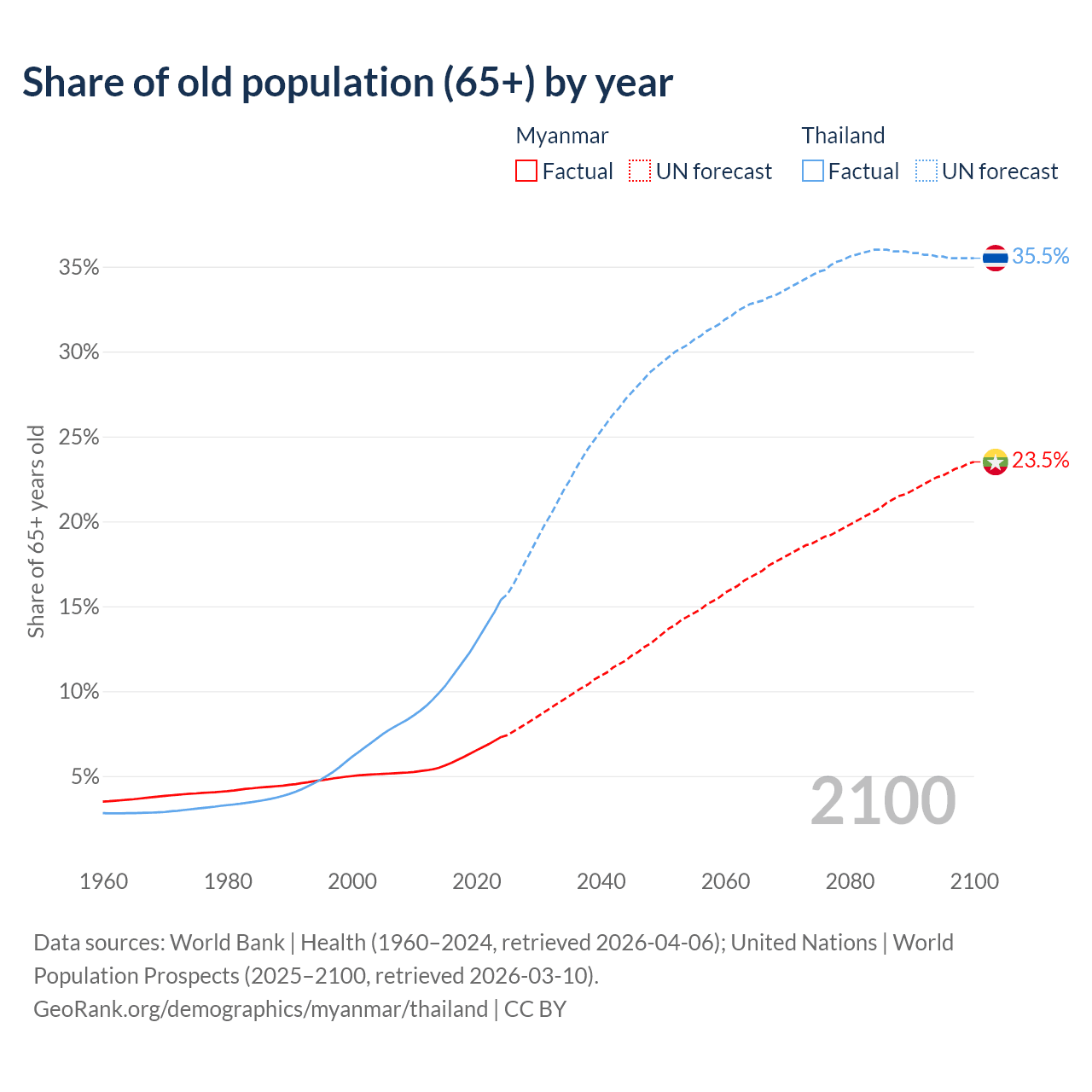 The share of older people aged 65 and over is 7.3% in Myanmar and 15.4% in Thailand. Life expectancy in Myanmar compared to Thailand .