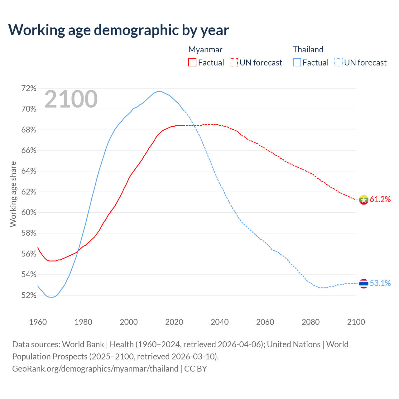 - Myanmar has 37.8M working age adults (aged 15-64) vs 50M in Thailand.