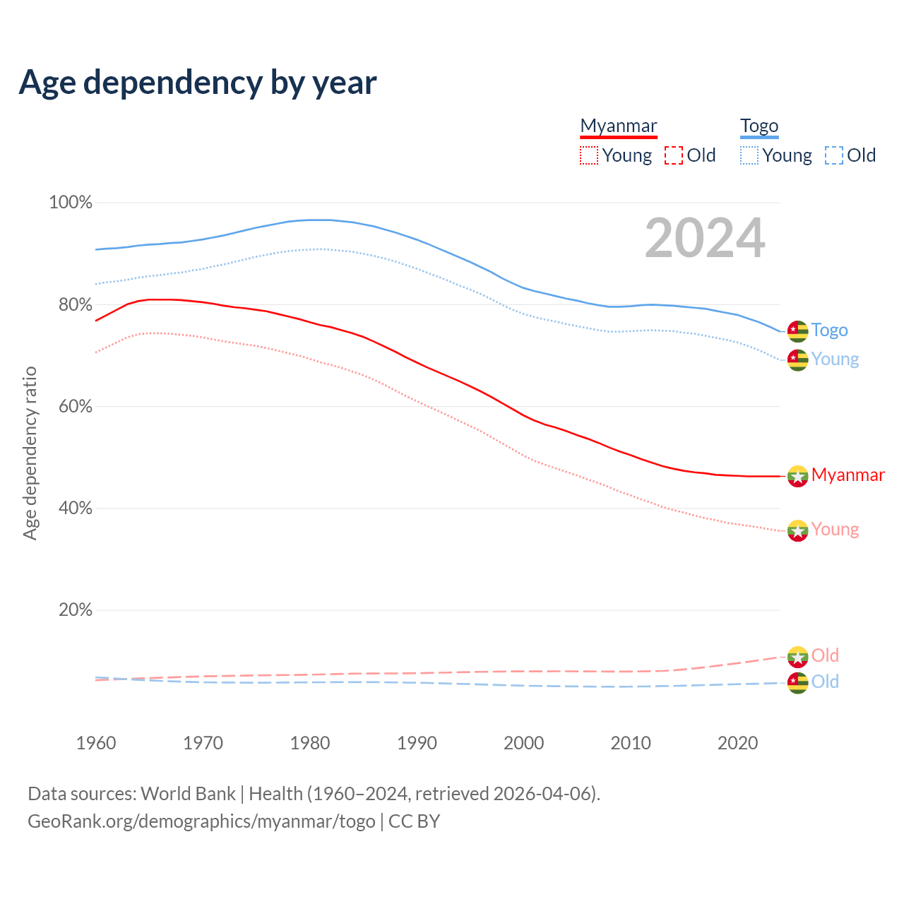 The share of older people aged 65 and over is 7.3% in Myanmar and 3.21% in Togo. Life expectancy in Myanmar compared to Togo .