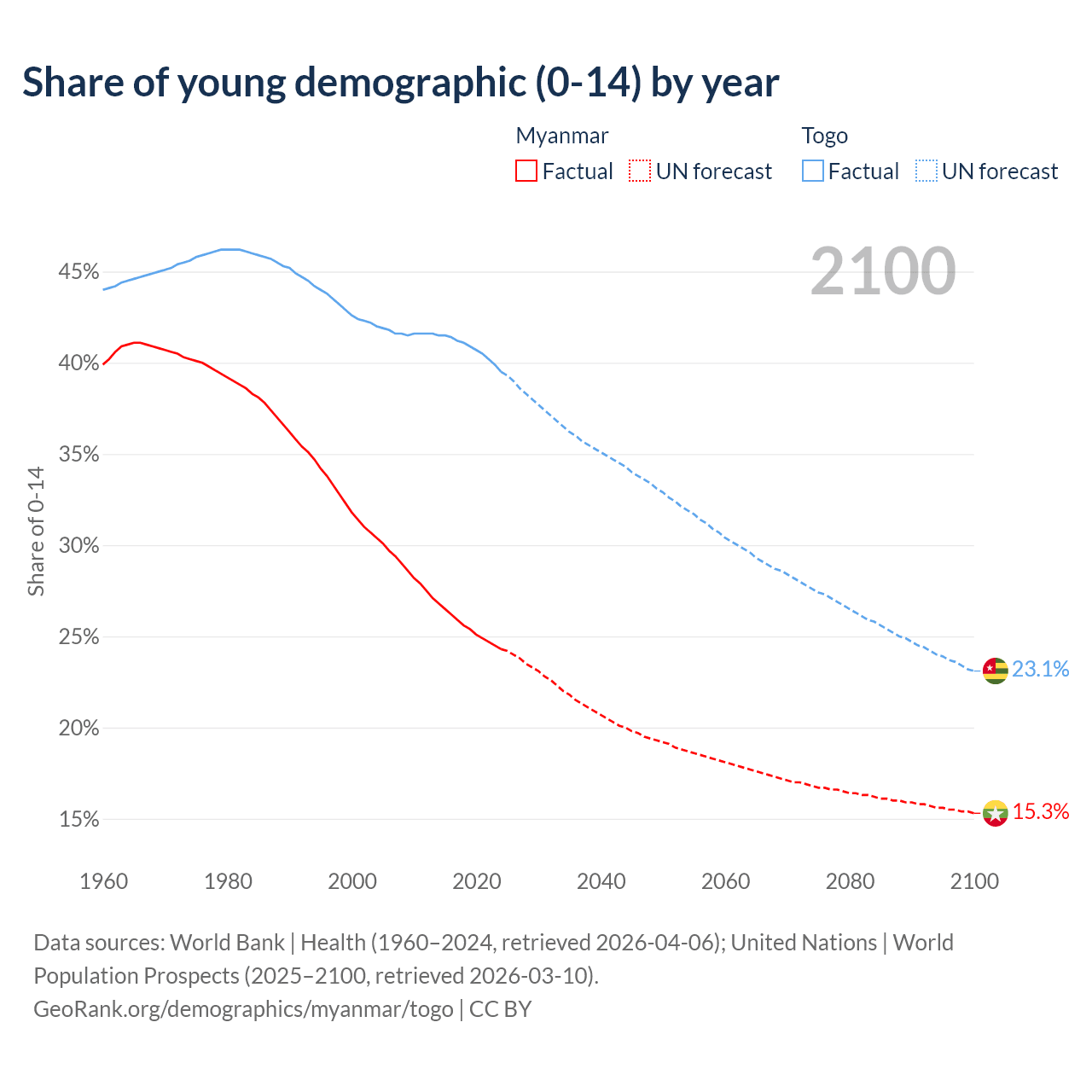 - The share of young demographic (0-15 years old) in Myanmar is 24.3% vs 39.5% in Togo.