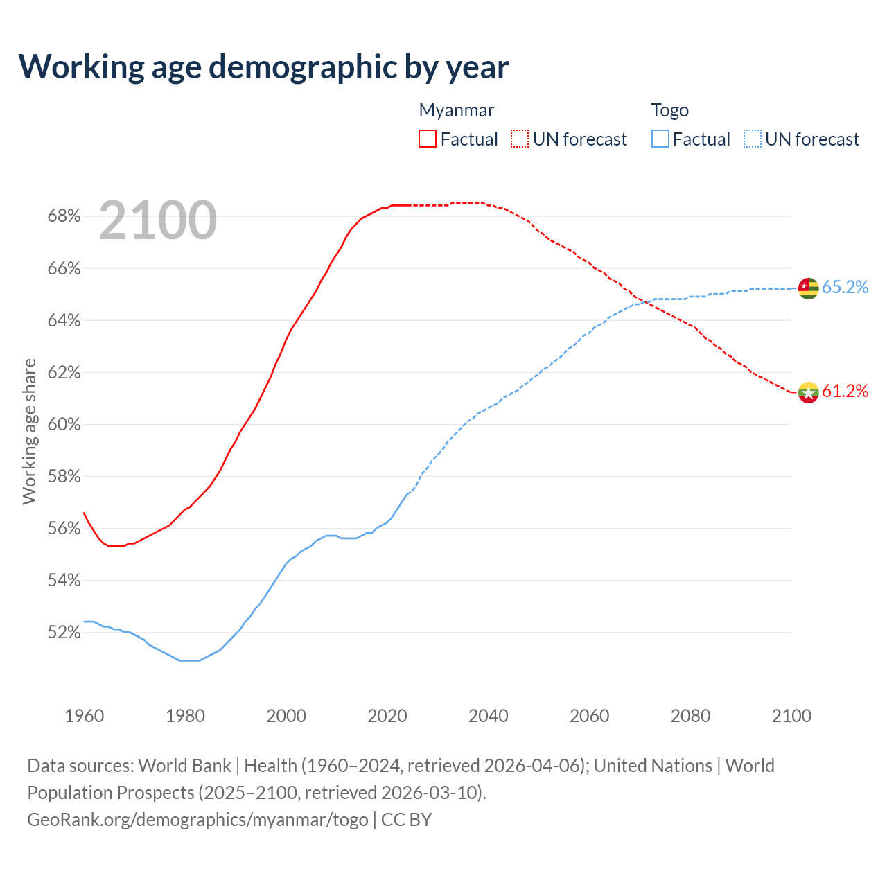 Median age Myanmar vs Togo, 1960-2100