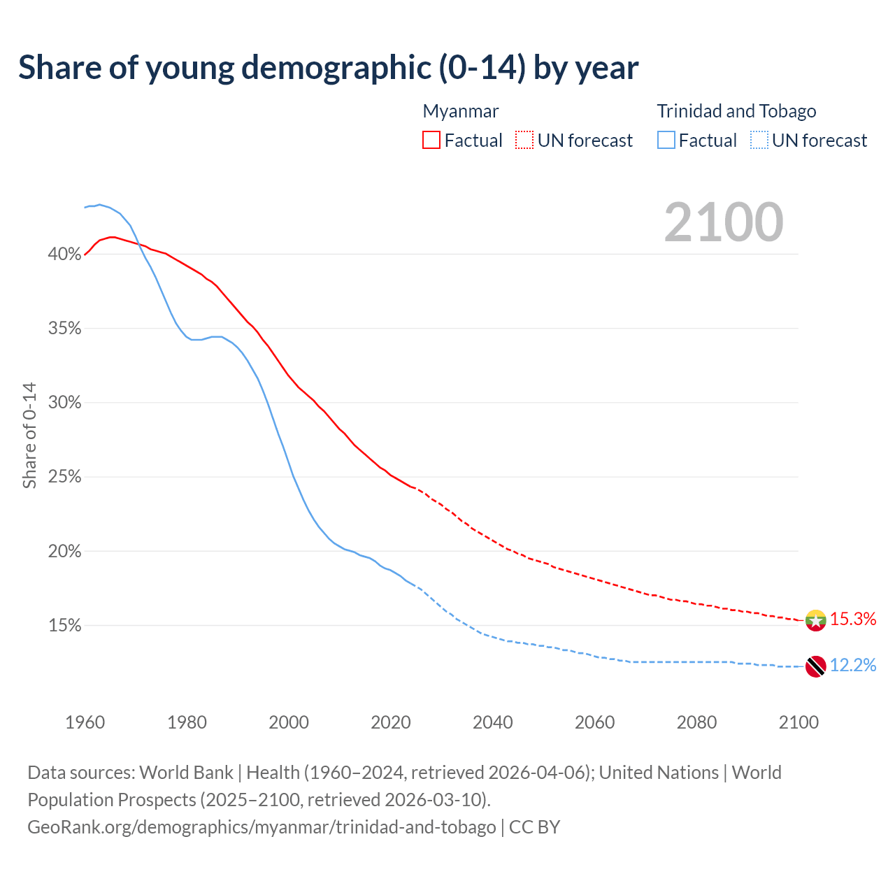 - The share of young demographic (0-15 years old) in Myanmar is 24.3% vs 17.8% in Trinidad and Tobago.