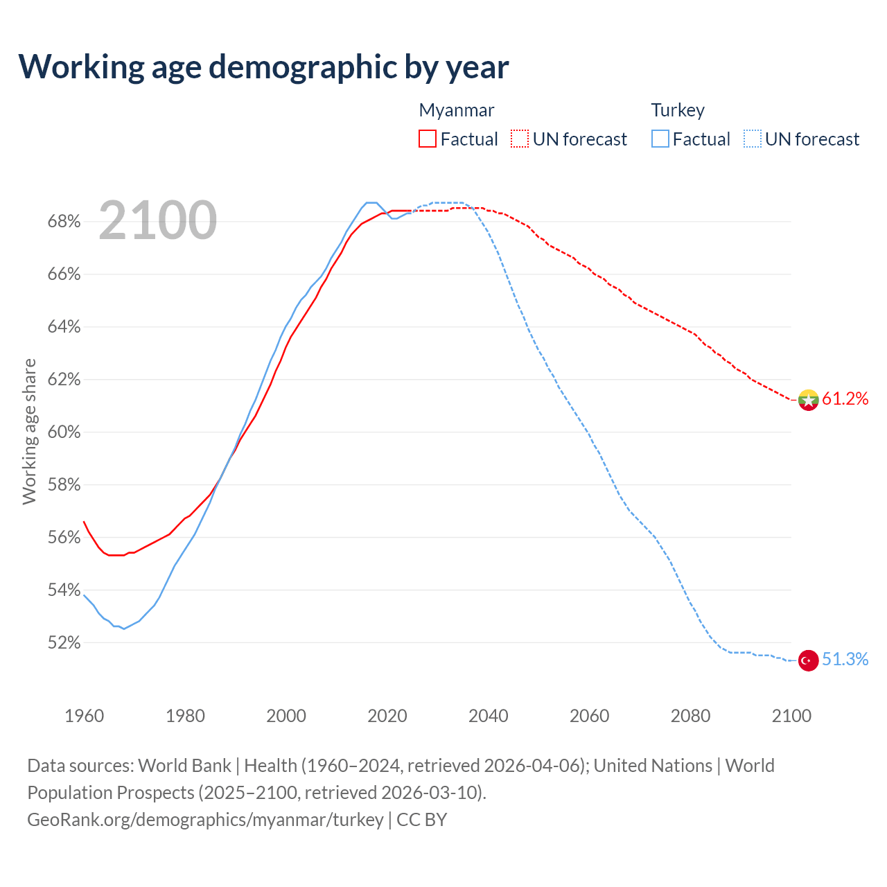 Median age Myanmar vs Turkey, 1960-2100