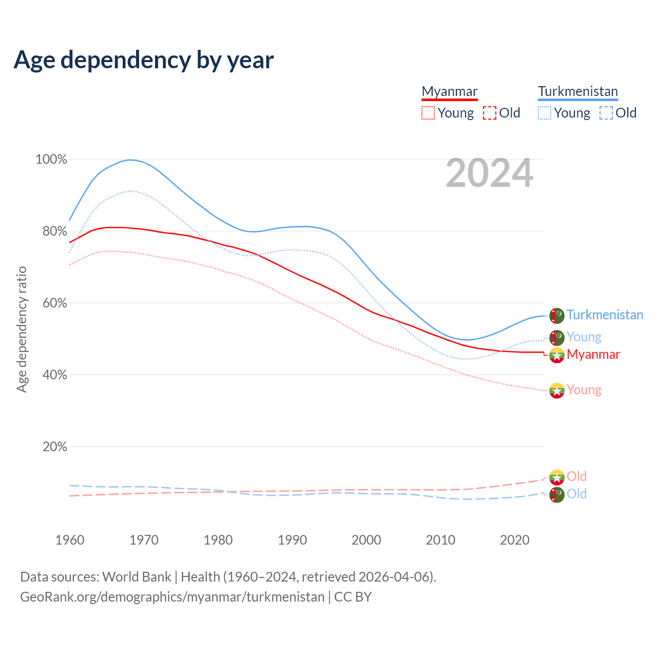 - Myanmar is ranked 96/196 by median age (oldest to youngest) vs 119/196 for Turkmenistan.