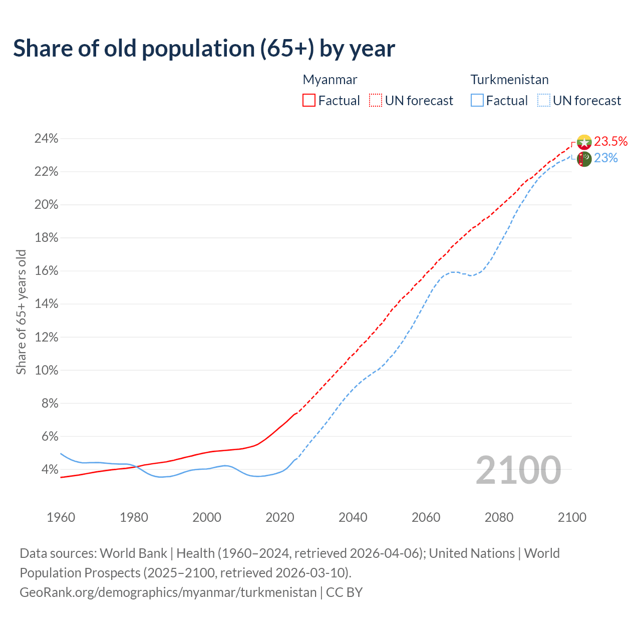 The share of older people aged 65 and over is 7.3% in Myanmar and 4.53% in Turkmenistan. Life expectancy in Myanmar compared to Turkmenistan .