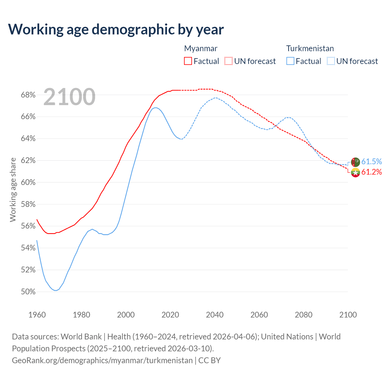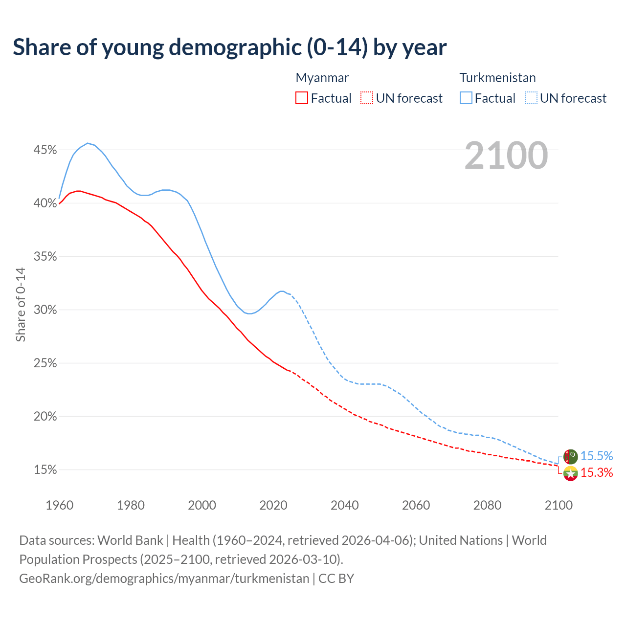Median age Myanmar vs Turkmenistan, 1960-2100