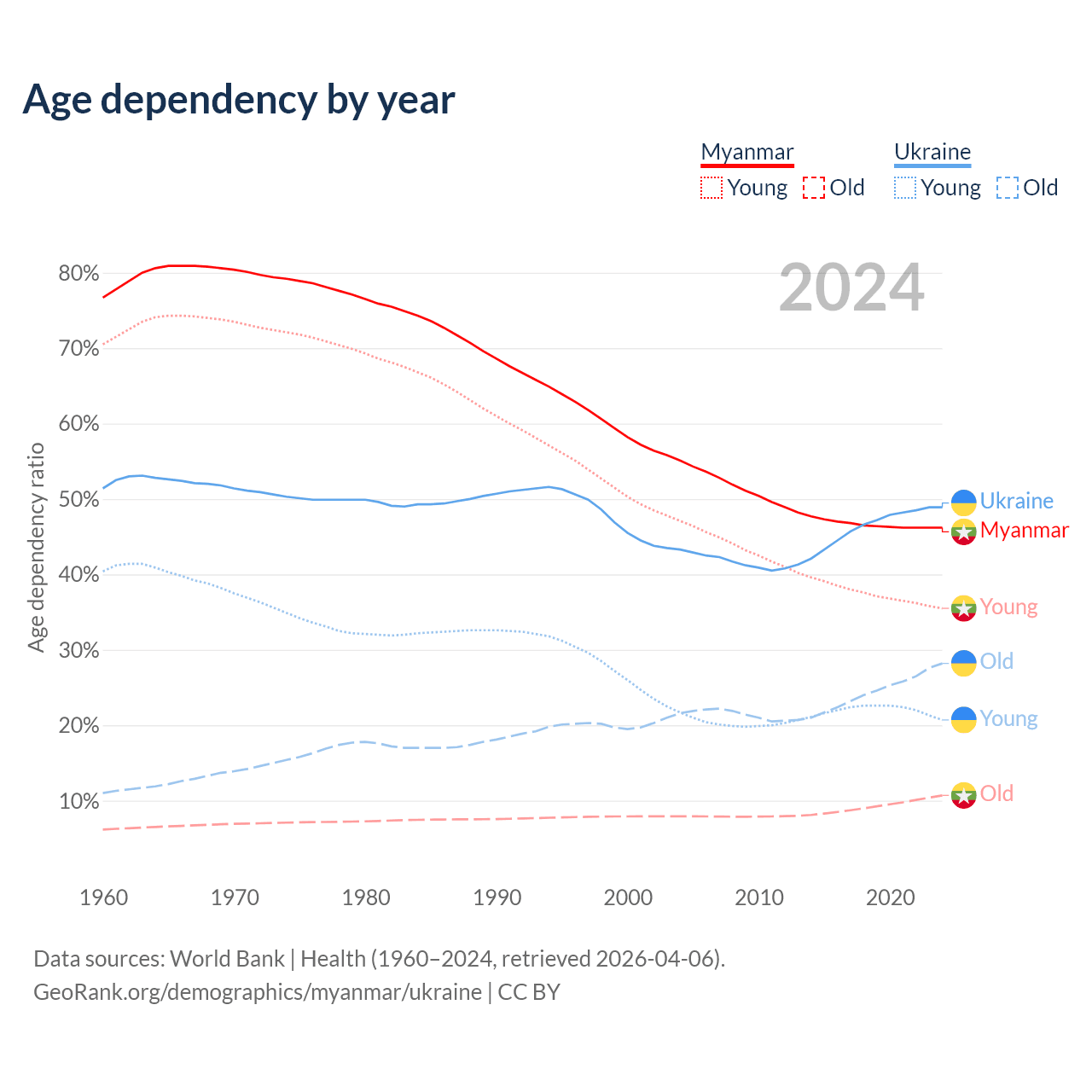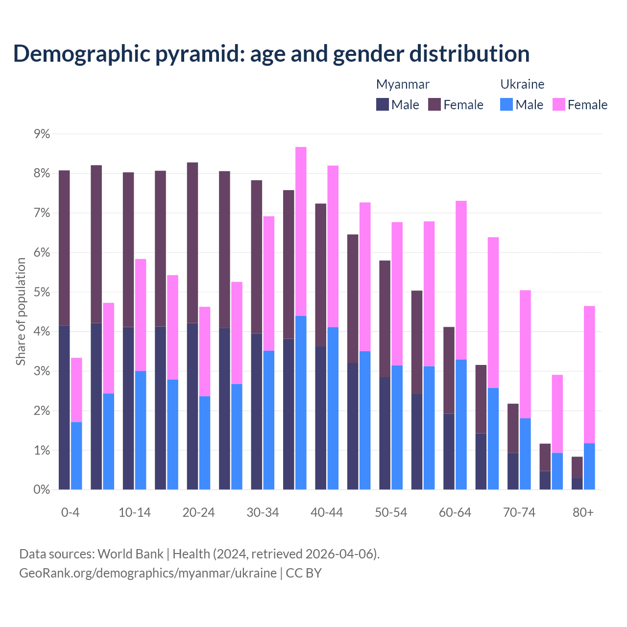 - Myanmar is ranked 96/196 by median age (oldest to youngest) vs 26/196 for Ukraine.
