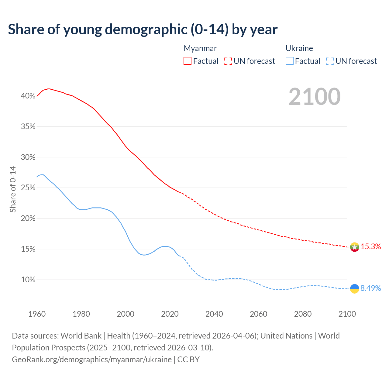 - The share of young demographic (0-15 years old) in Myanmar is 24.3% vs 13.9% in Ukraine.
