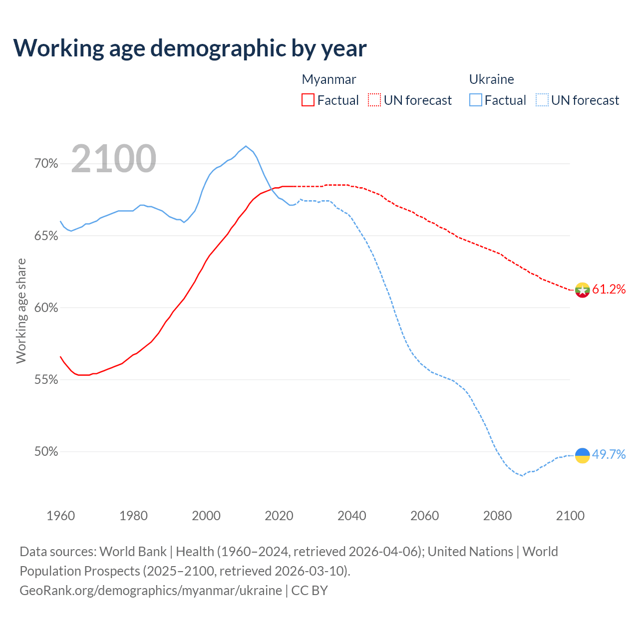 - Myanmar has 37.8M working age adults (aged 15-64) vs 26.9M in Ukraine.