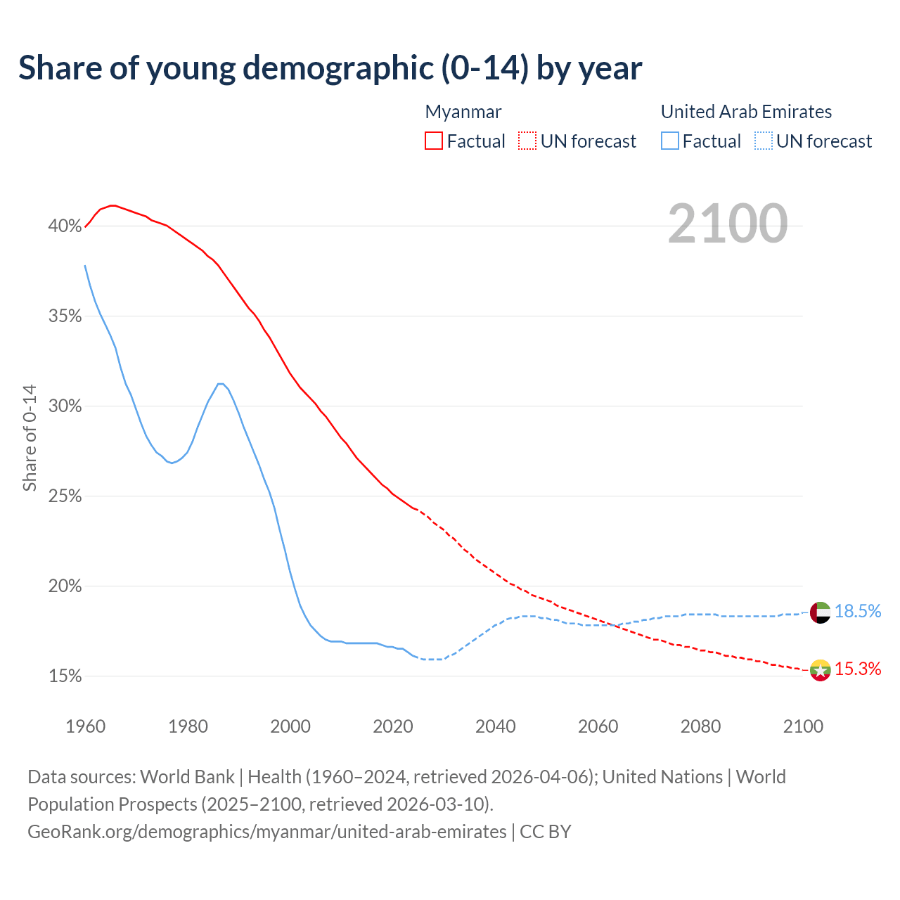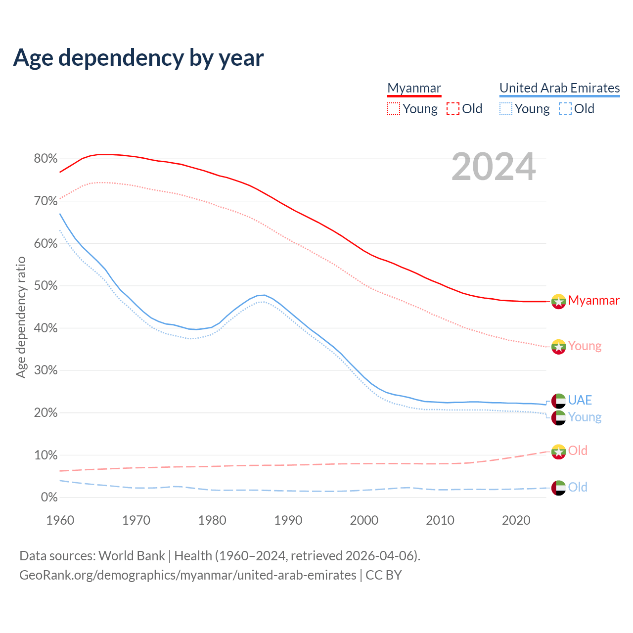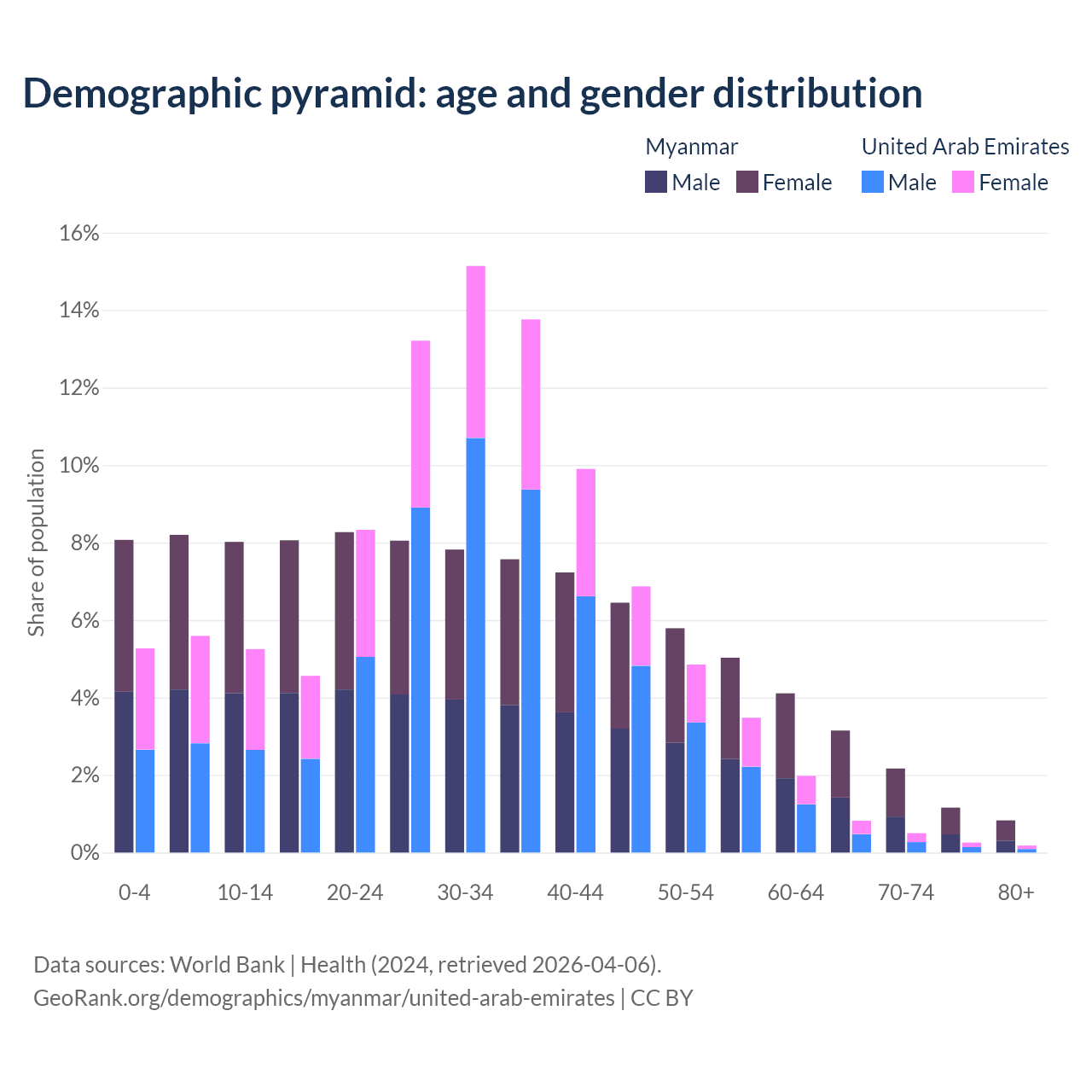 - Myanmar is ranked 96/196 by median age (oldest to youngest) vs 91/196 for the United Arab Emirates.