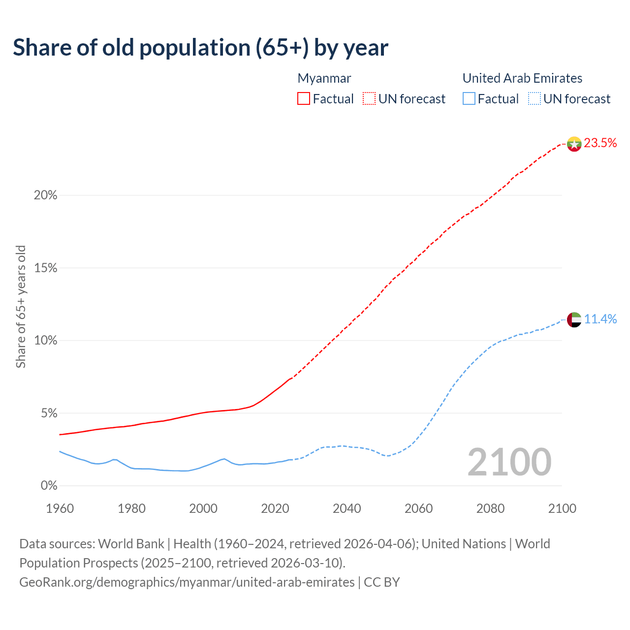 The share of older people aged 65 and over is 7.3% in Myanmar and 1.77% in the United Arab Emirates. Life expectancy in Myanmar compared to the United Arab Emirates .