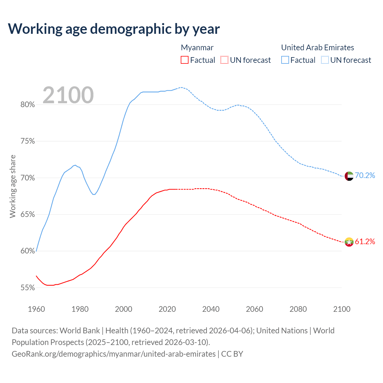- Myanmar has 37.8M working age adults (aged 15-64) vs 9.6M in the United Arab Emirates.