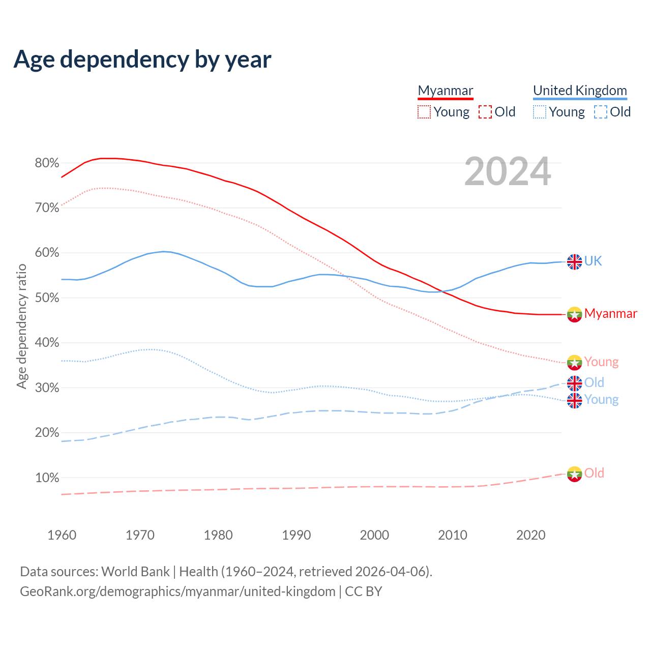 The share of older people aged 65 and over is 7.3% in Myanmar and 19.5% in the United Kingdom. Life expectancy in Myanmar compared to the United Kingdom .
