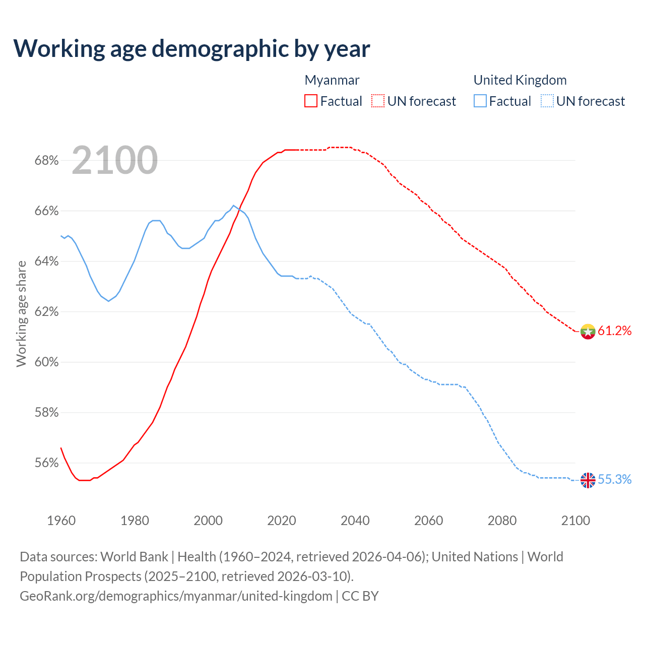 - Myanmar has 37.8M working age adults (aged 15-64) vs 44.4M in the United Kingdom.