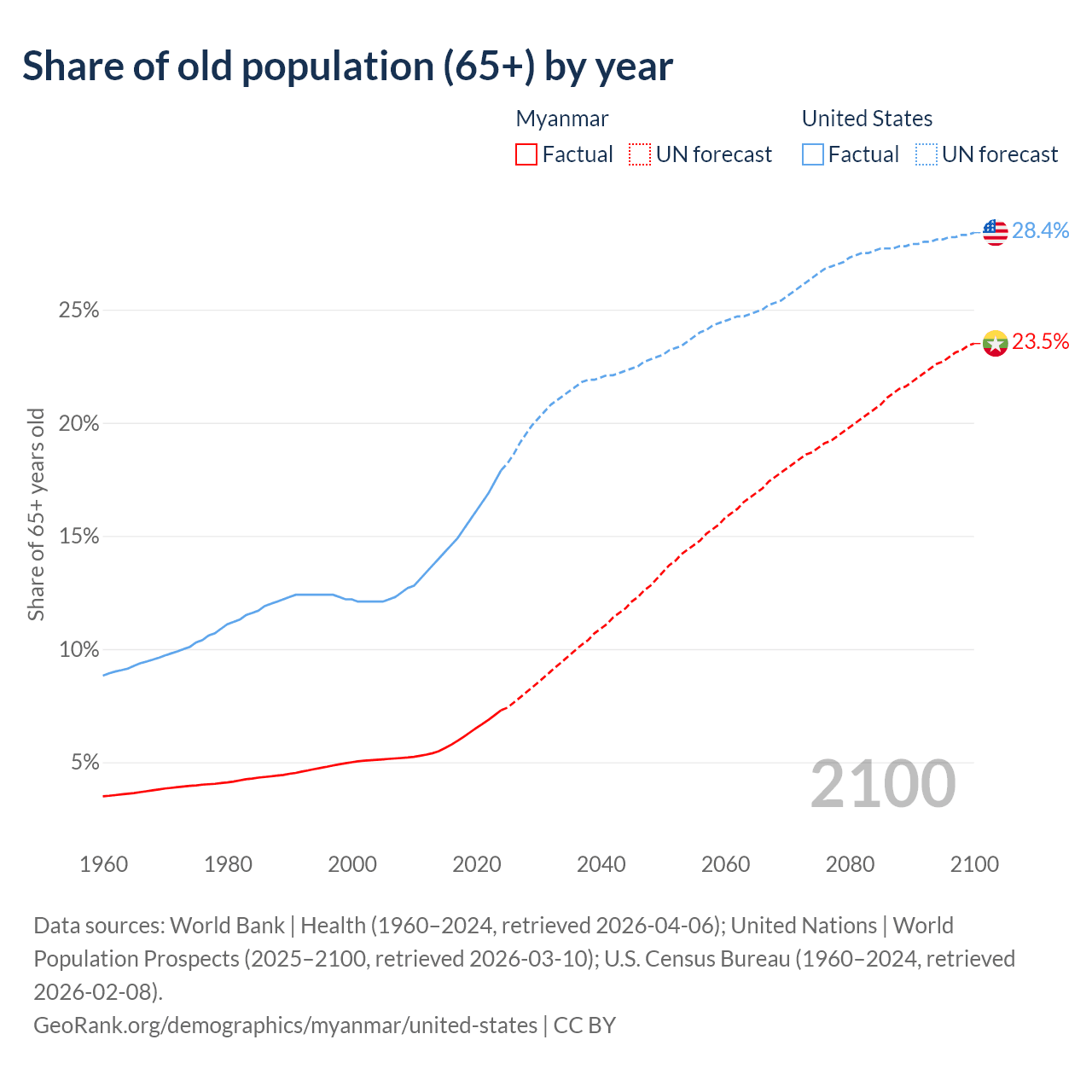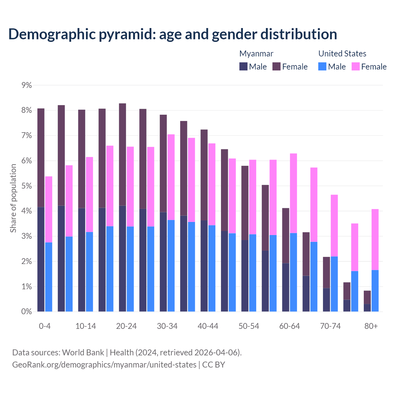 The share of older people aged 65 and over is 7.3% in Myanmar and 17.9% in the United States. Life expectancy in Myanmar compared to the United States .