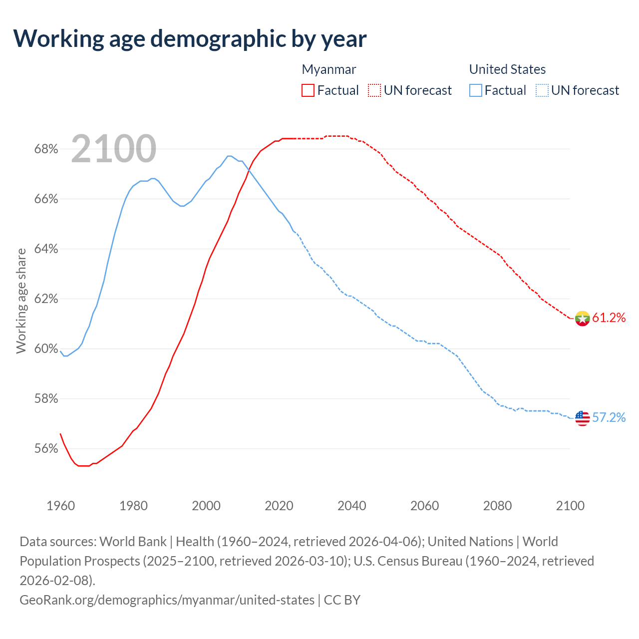 Median age Myanmar vs United States, 1960-2100