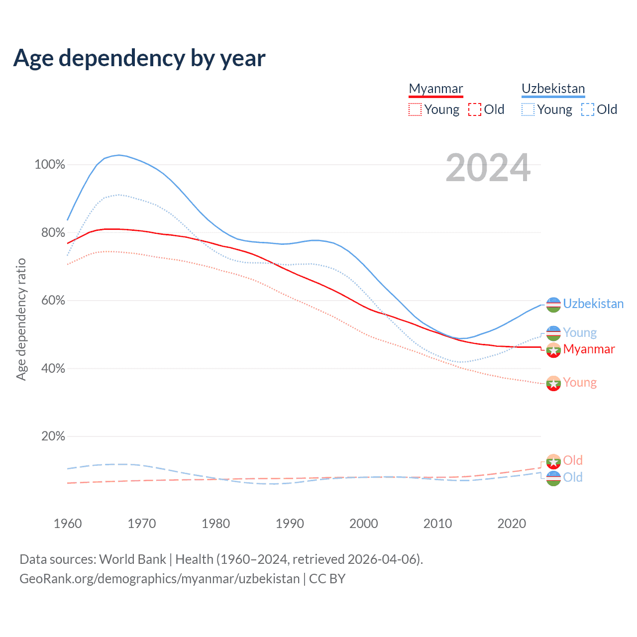 Data sources: World Bank | Health (1960–2024, retrieved 2026-04-06); U.S. Census Bureau (1960–2024, retrieved 2026-02-08).