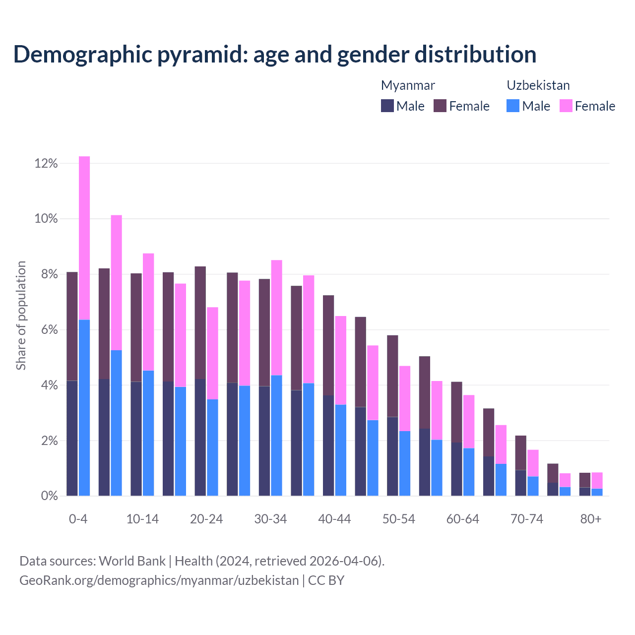 The share of older people aged 65 and over is 7.3% in Myanmar and 5.86% in Uzbekistan. Life expectancy in Myanmar compared to Uzbekistan .