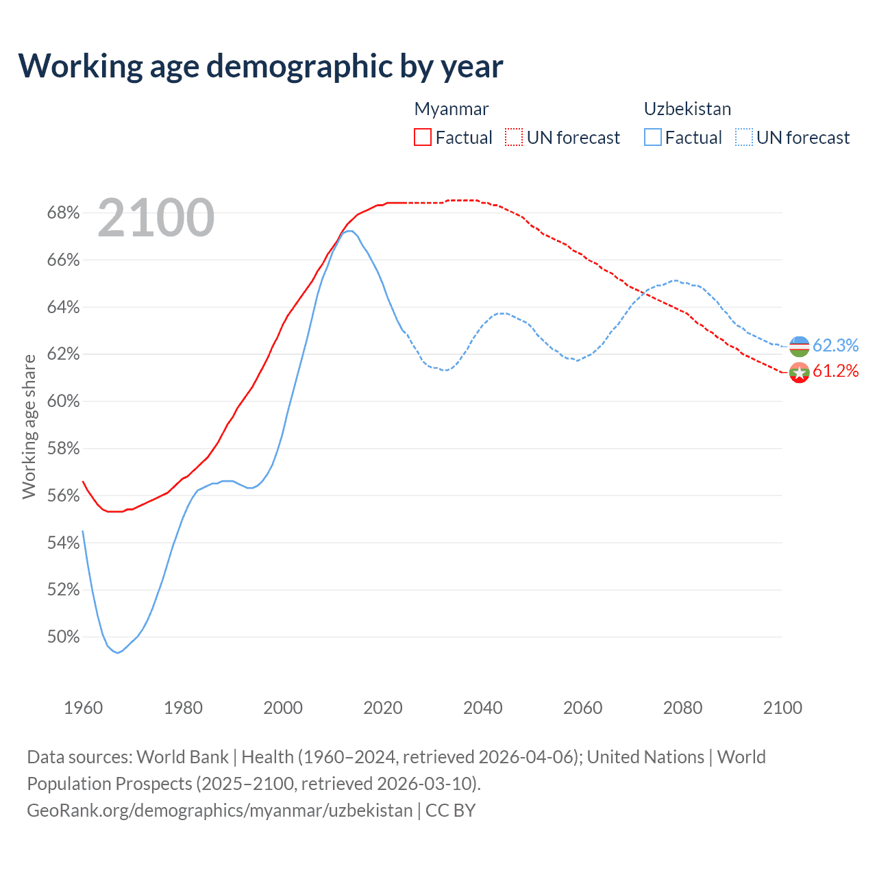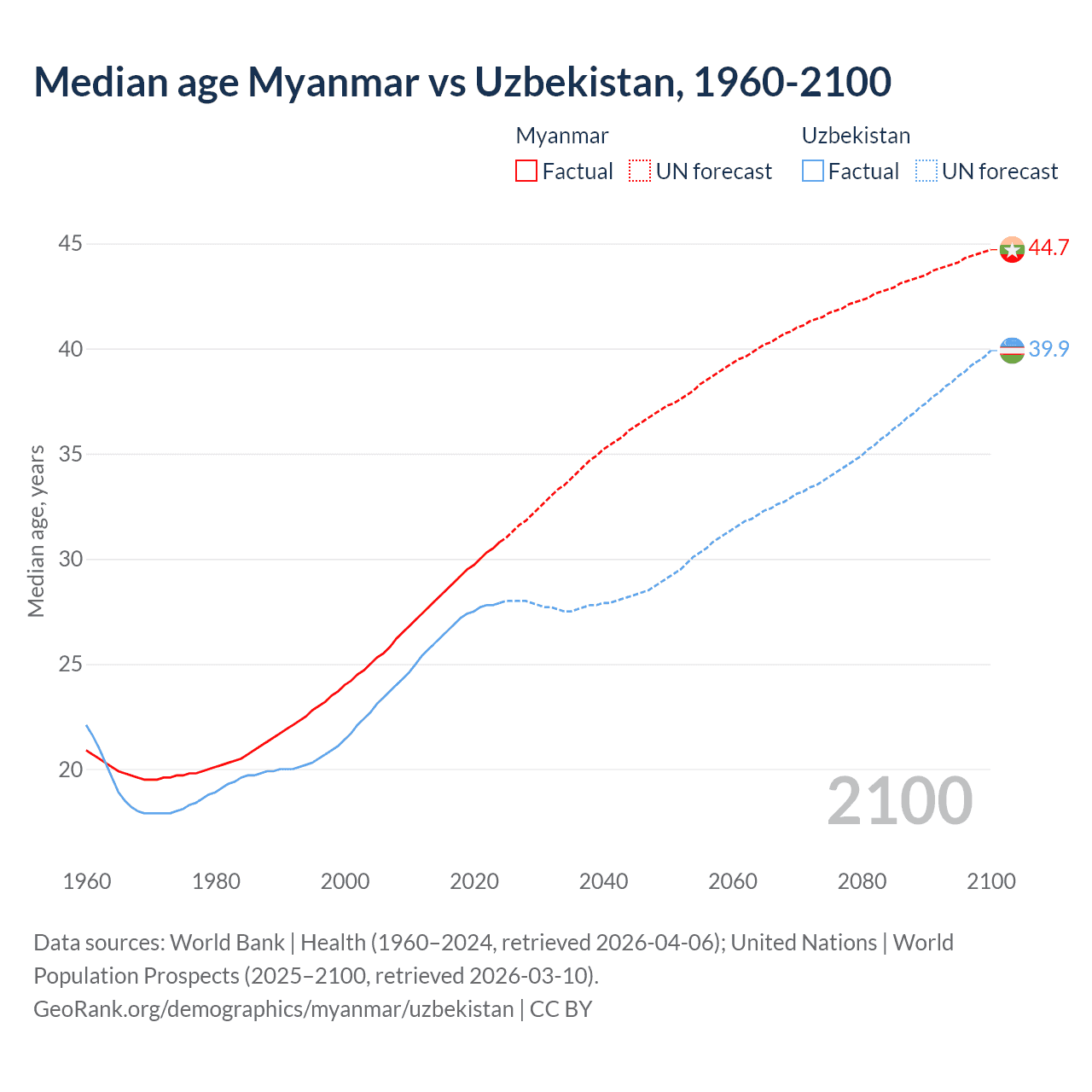 Median age Myanmar vs Uzbekistan, 1960-2100